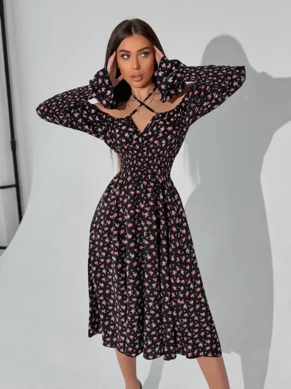 Характеристики сукні міді з принтом червона квітка на чорному