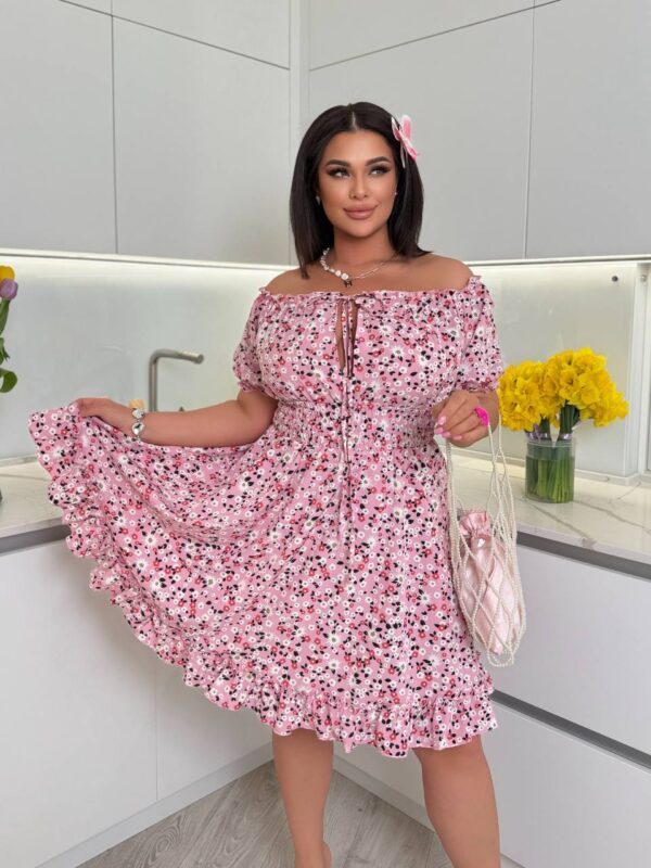 Рожевий фон чудово поєднується з квітковим принтом, створюючи ефект повітряної акварелі. Ідеально підходить для побачень, прогулянок чи відпустки біля моря.