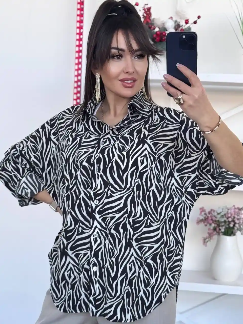 Доповніть свій гардероб чорною сорочкою оверсайз з принтом зебра – трендовий вибір для стильних образів! 🖤✨