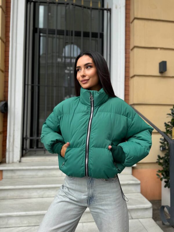 Пуховик жіночий короткий з манжетами зеленого кольору 00313