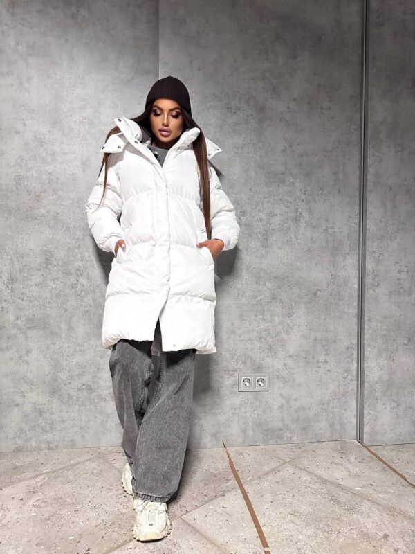 Пуховик жіночий білий довгий 100см — це вишуканий та практичний вибір для холодної зими. Чистий білий колір додає образу елегантності й робить його свіжим і сучасним. Модель забезпечує максимальний комфорт і тепло навіть у найлютіші морози до -30°C.