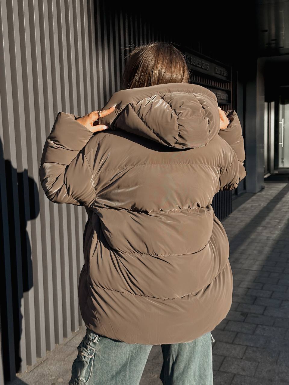 Пуховик жіночий оверсайз коричневого кольору 00418