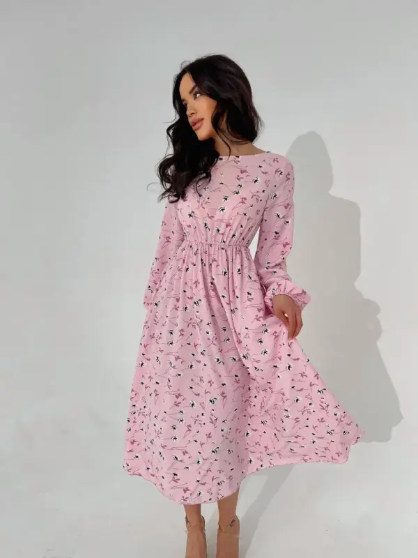 Сукня міді з довгим рукавом рожева в квітку – ніжність та комфорт у кожній деталі
