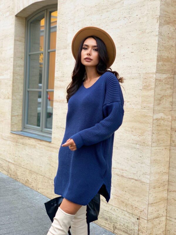 Сукня-туніка жіноча в’язана – колір джинс – це ідеальний вибір для прохолодної погоди. М’яка та приємна до тіла тканина забезпечує комфорт у щоденному носінні, а вільний фасон дозволяє виглядати стильно та жіночно.