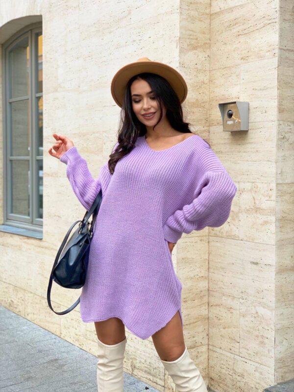 Сукня-туніка жіноча в’язана – колір лаванда легко поєднується з легінсами, джинсами або високими чоботами, створюючи як повсякденні, так і стильні вечірні образи.