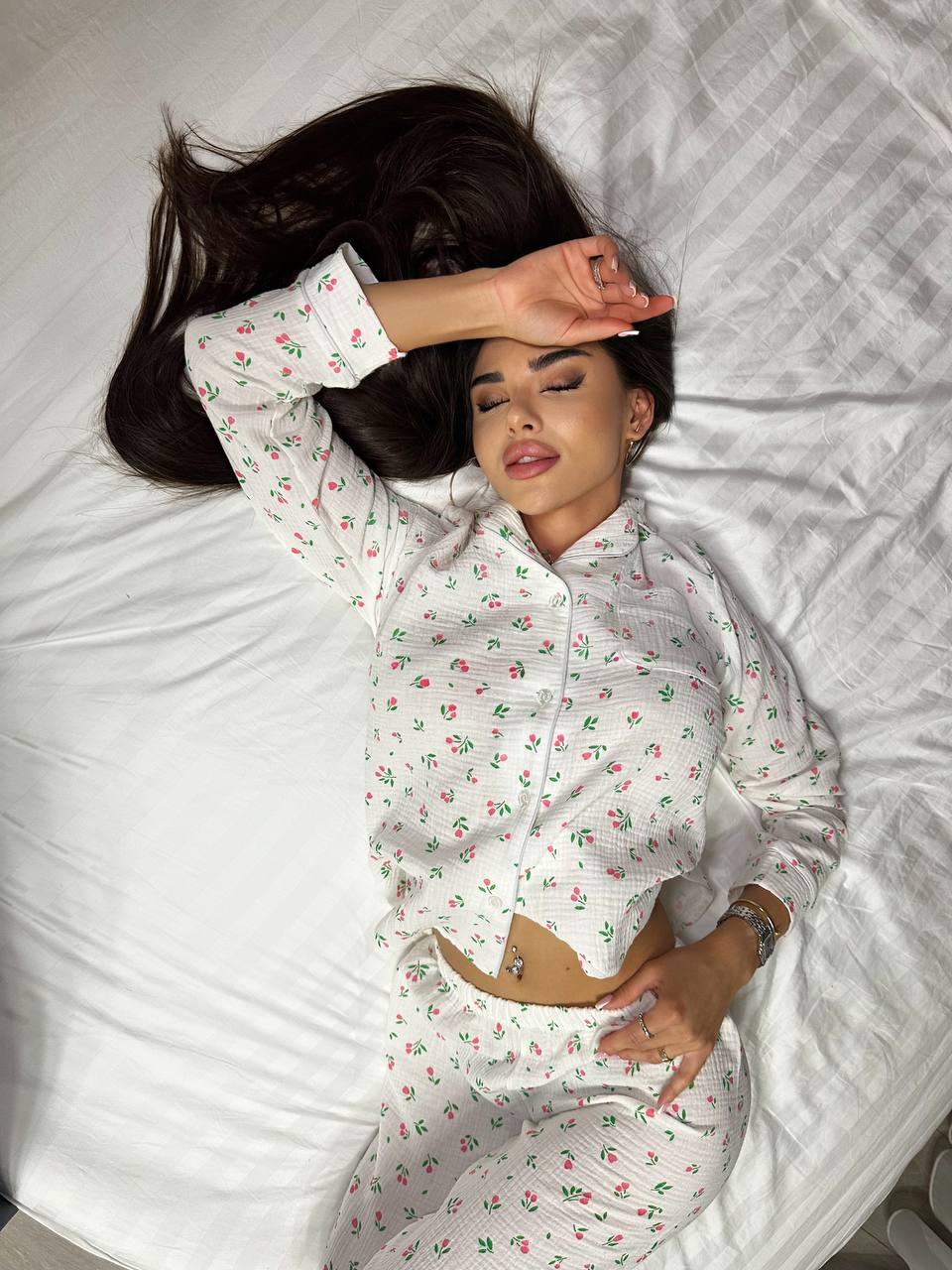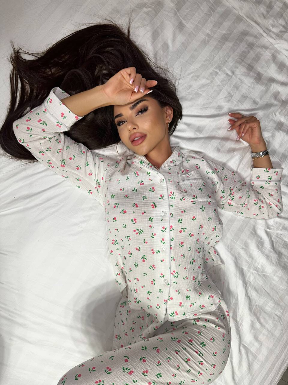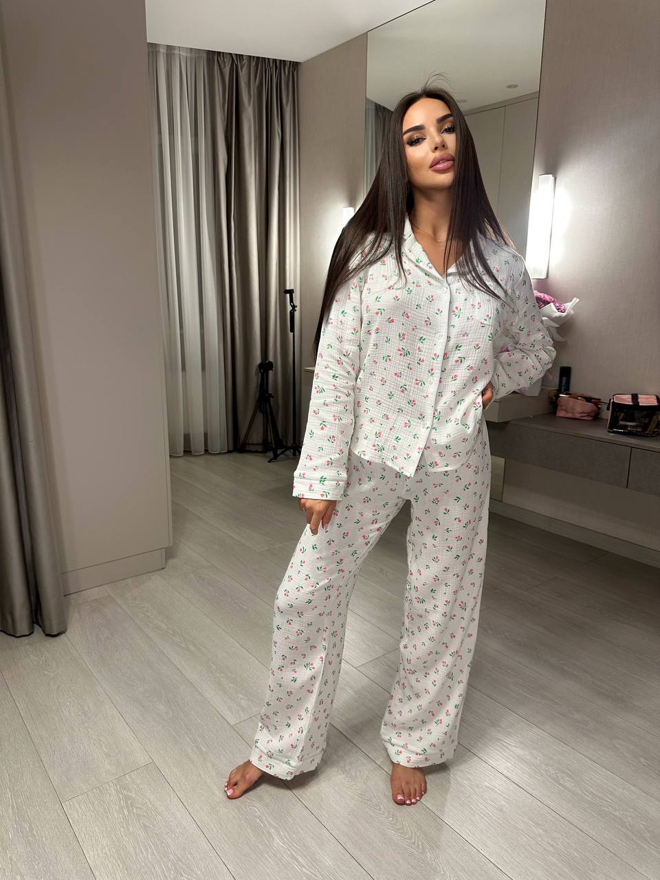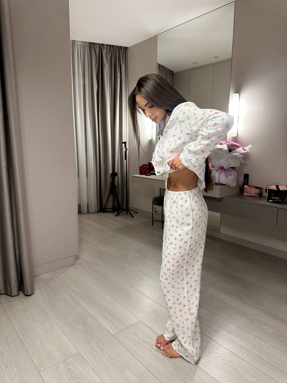 Додати до відстеження цінЖіноча піжама з сорочкою та штанами в квітку рожевого кольору створена для максимального комфорту під час сну та домашнього відпочинку. Легка, дихаюча тканина приємно торкається шкіри й забезпечує ідеальний мікроклімат у будь-яку пору року. Квітковий принт додає жіночності та ніжності образу.
