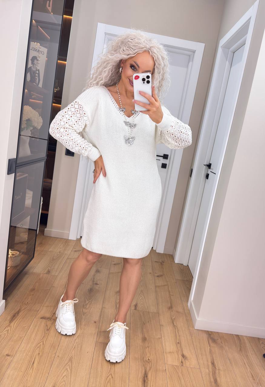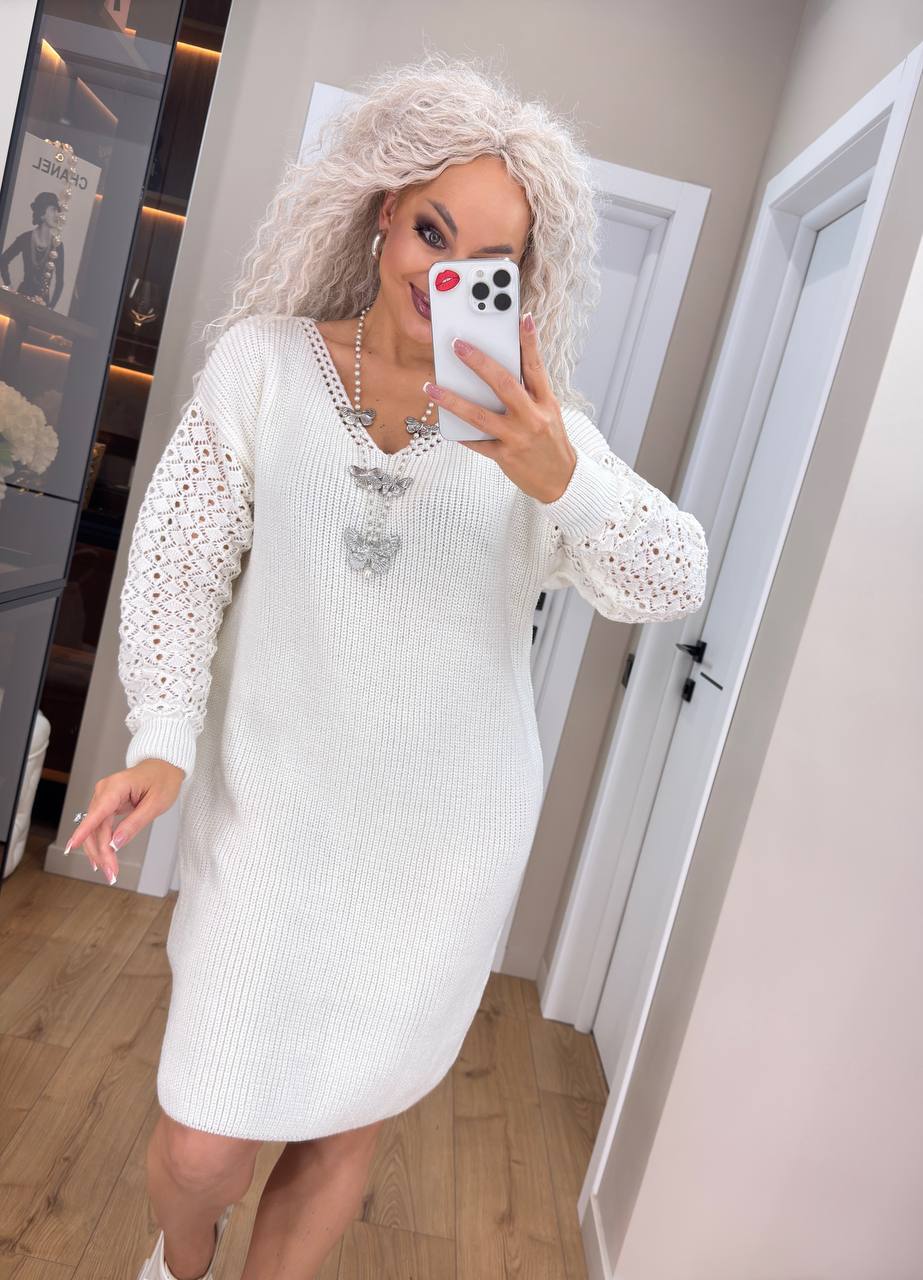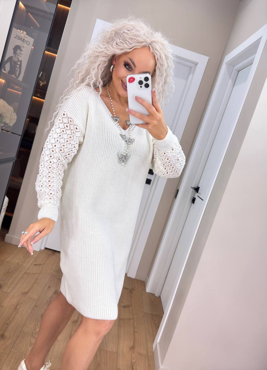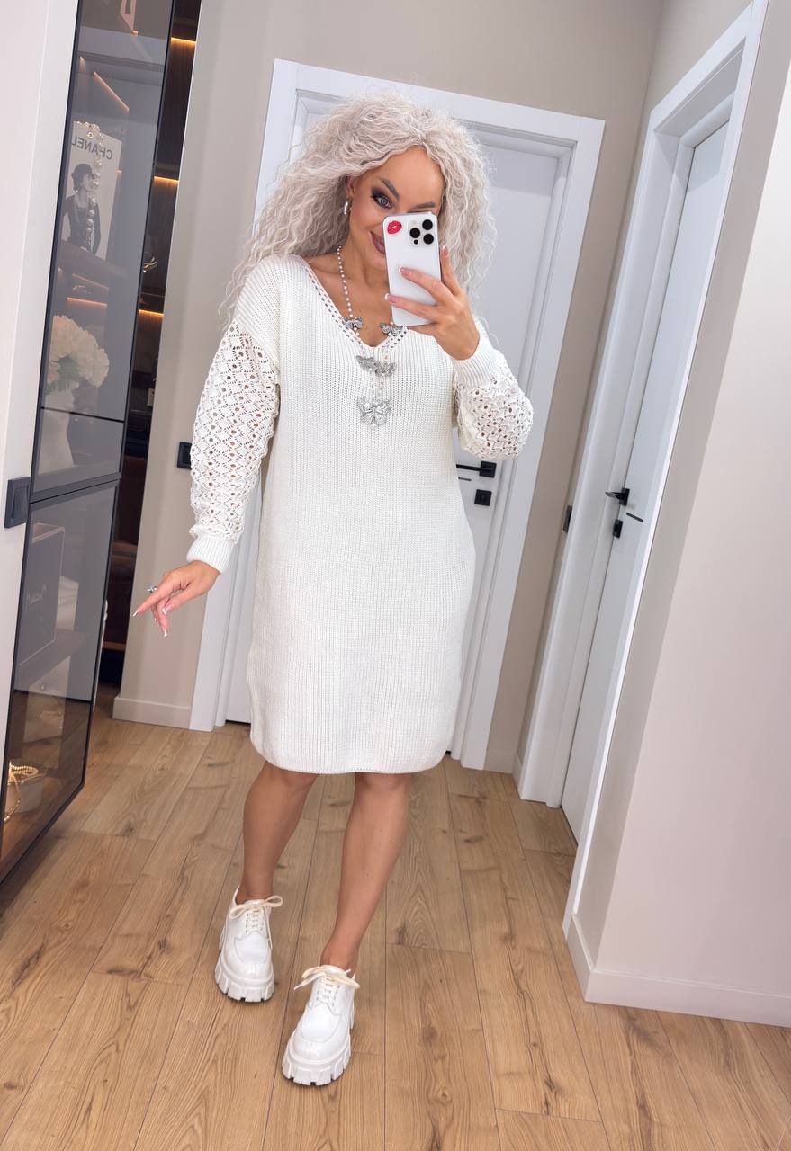 Жіноча в’язана сукня з ажурними рукавами молоко 00402