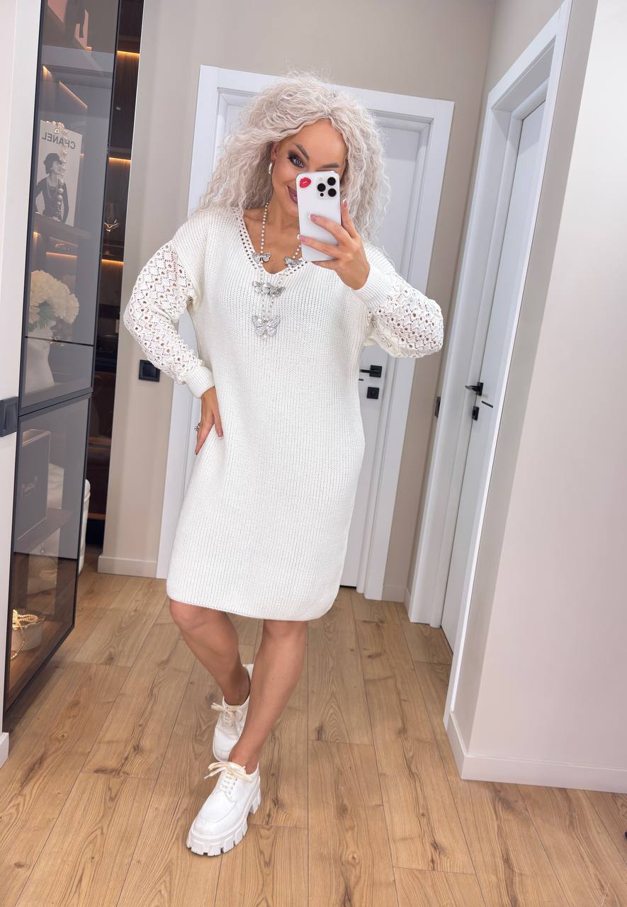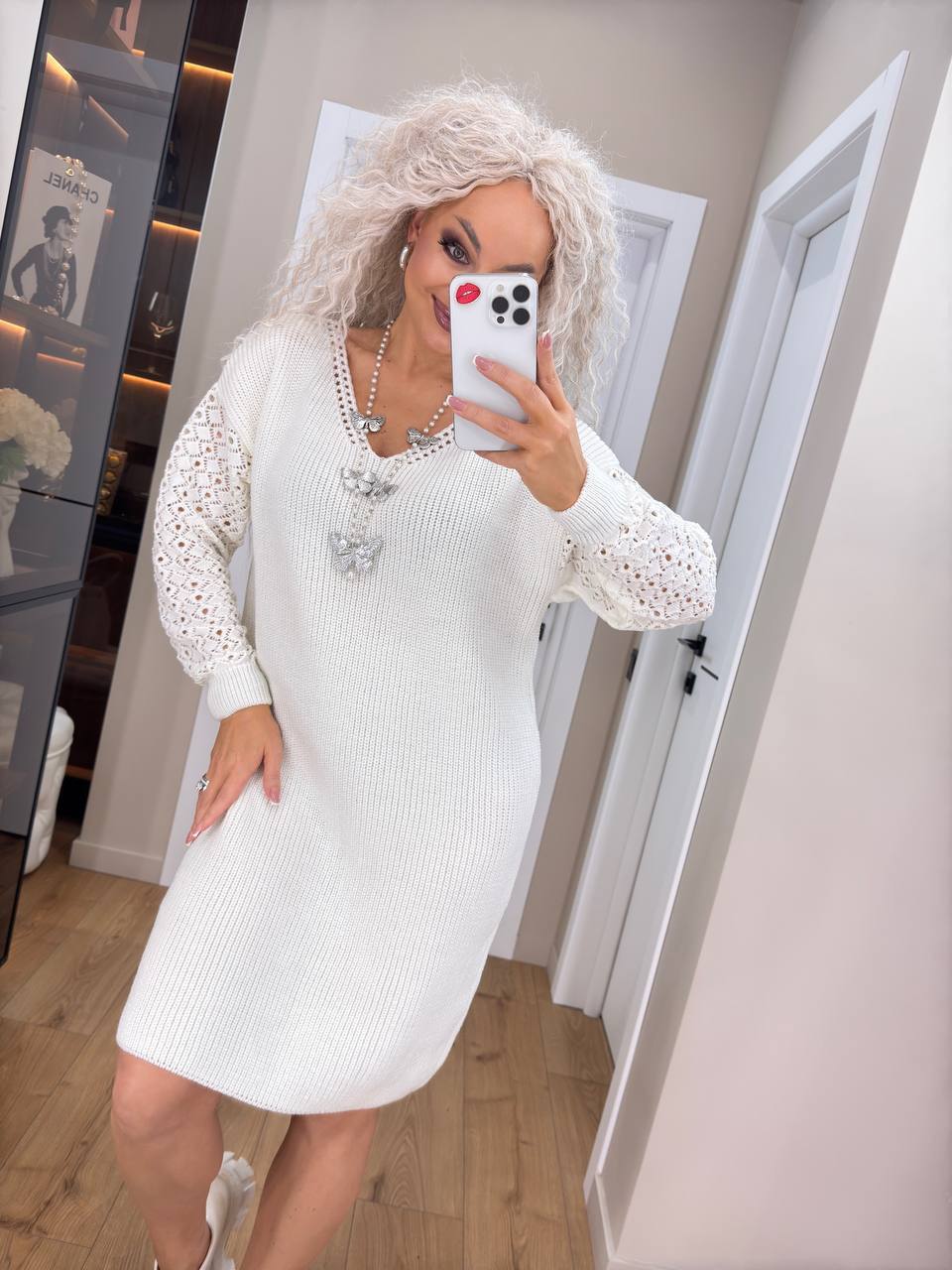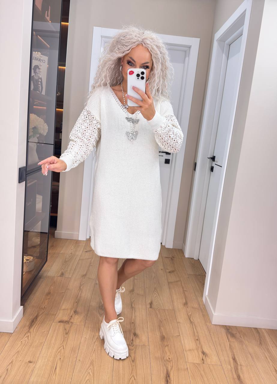 Жіноча в’язана сукня з ажурними рукавами молоко 00402