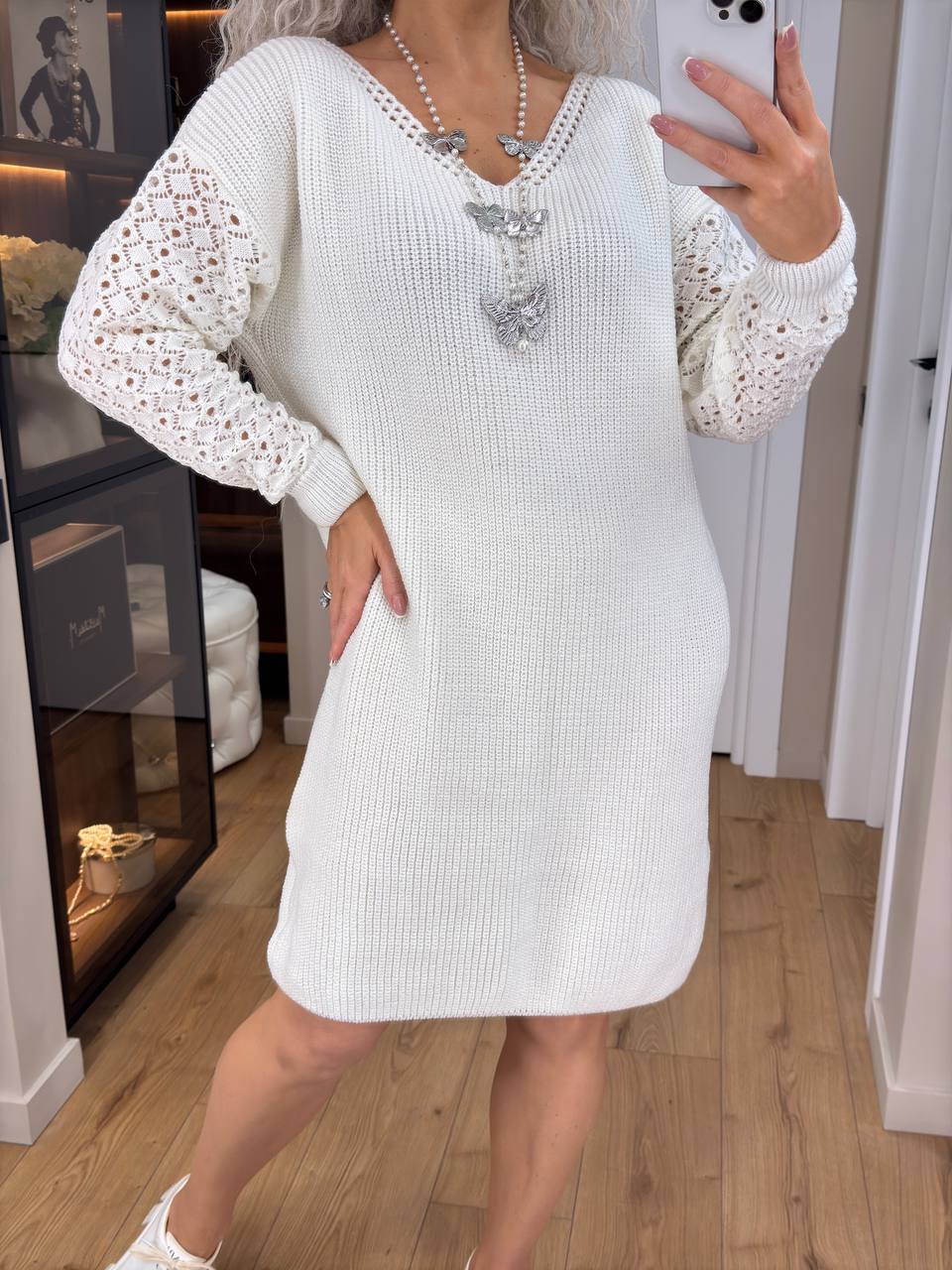 Жіноча в’язана сукня з ажурними рукавами молоко модель 5082 — стильне рішення для тих, хто цінує комфорт і жіночність. Вільний крій дарує свободу рухів, а м’який матеріал із вовни та акрилу зігріває у прохолодні дні. Ажурні рукави створюють елегантний акцент, а V-подібний виріз додає образу витонченості. Сукня підходить як для щоденного носіння, так і для особливих випадків.
