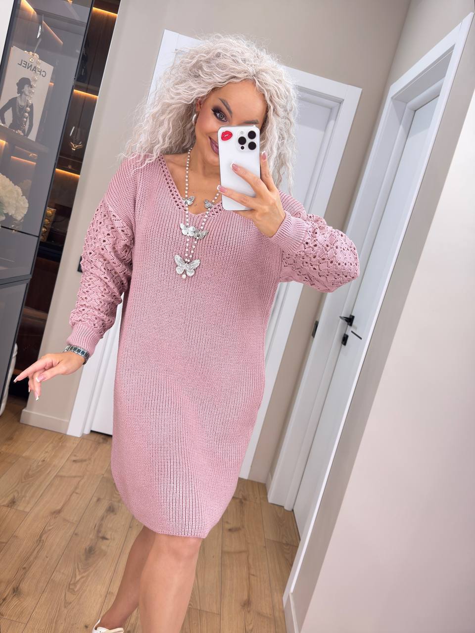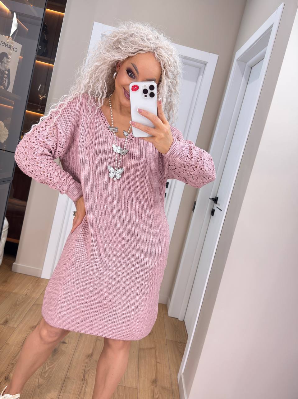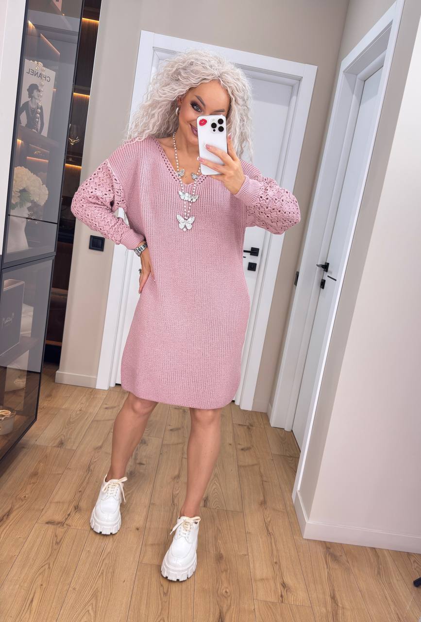 Жіноча в’язана сукня з ажурними рукавами пудра 00400