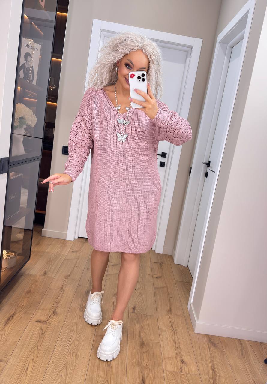 Жіноча в’язана сукня з ажурними рукавами пудра модель 5082 — стильне рішення для тих, хто цінує комфорт і жіночність. Вільний крій дарує свободу рухів, а м’який матеріал із вовни та акрилу зігріває у прохолодні дні. Ажурні рукави створюють елегантний акцент, а V-подібний виріз додає образу витонченості. Сукня підходить як для щоденного носіння, так і для особливих випадків.