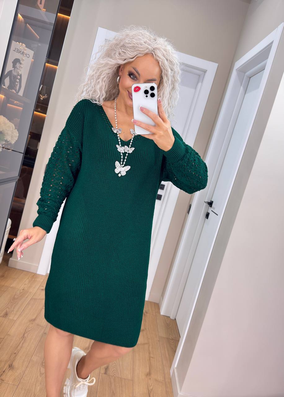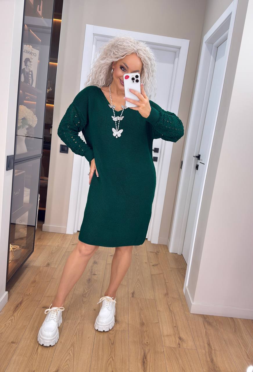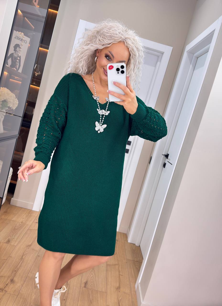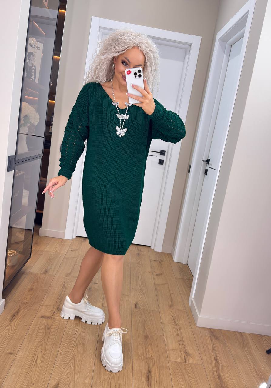 Жіноча в’язана сукня з ажурними рукавами смарагд 00401