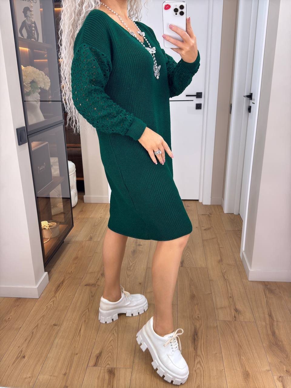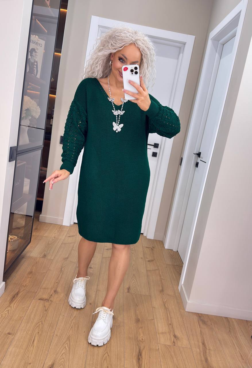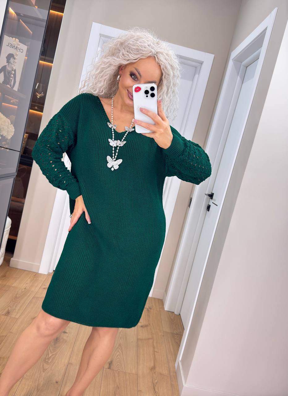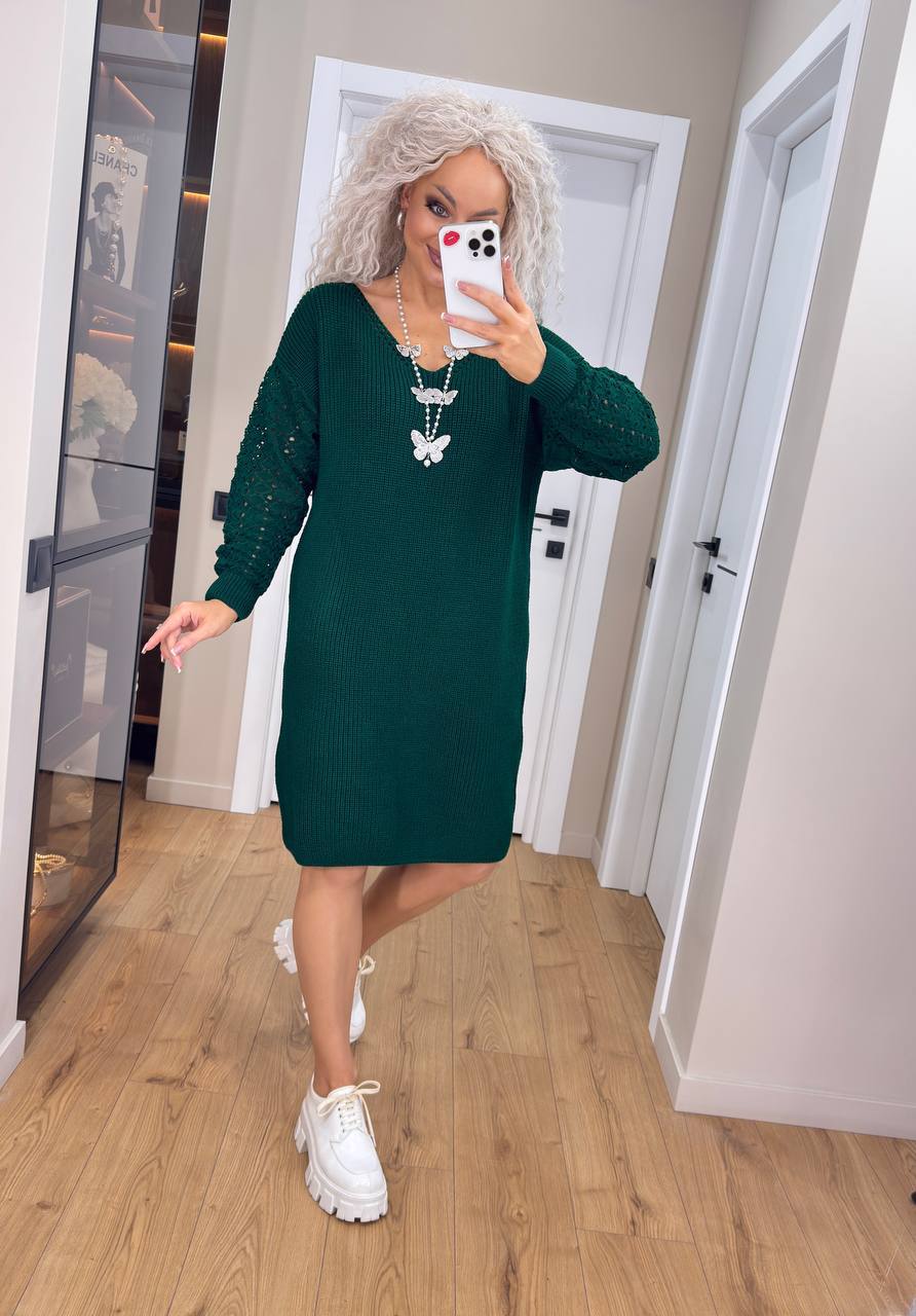 Жіноча в’язана сукня з ажурними рукавами смарагд 00401