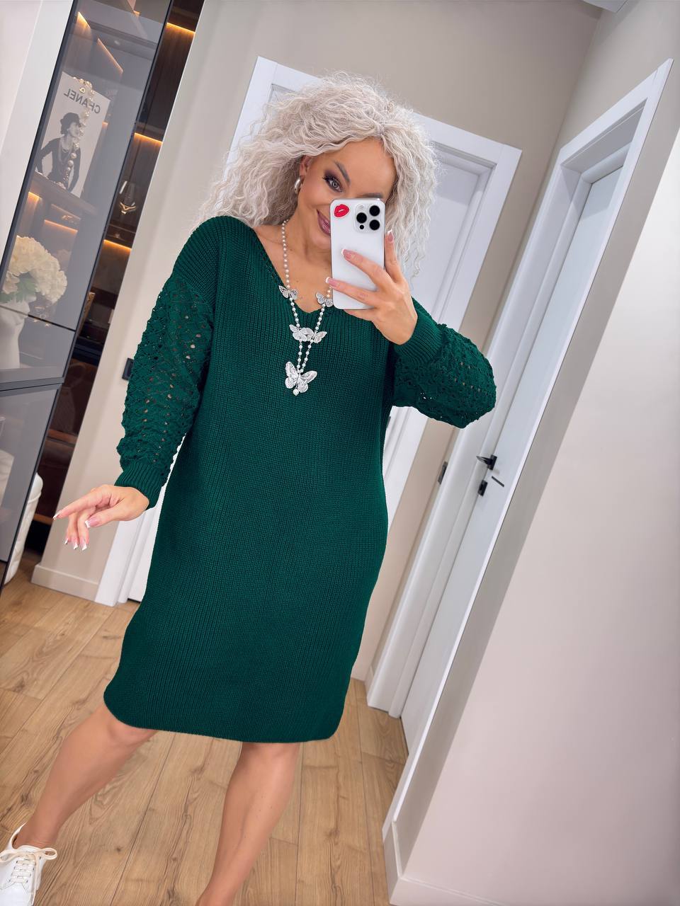 Жіноча в’язана сукня з ажурними рукавами смарагд модель 5082 — стильне рішення для тих, хто цінує комфорт і жіночність. Вільний крій дарує свободу рухів, а м’який матеріал із вовни та акрилу зігріває у прохолодні дні. Ажурні рукави створюють елегантний акцент, а V-подібний виріз додає образу витонченості. Сукня підходить як для щоденного носіння, так і для особливих випадків.