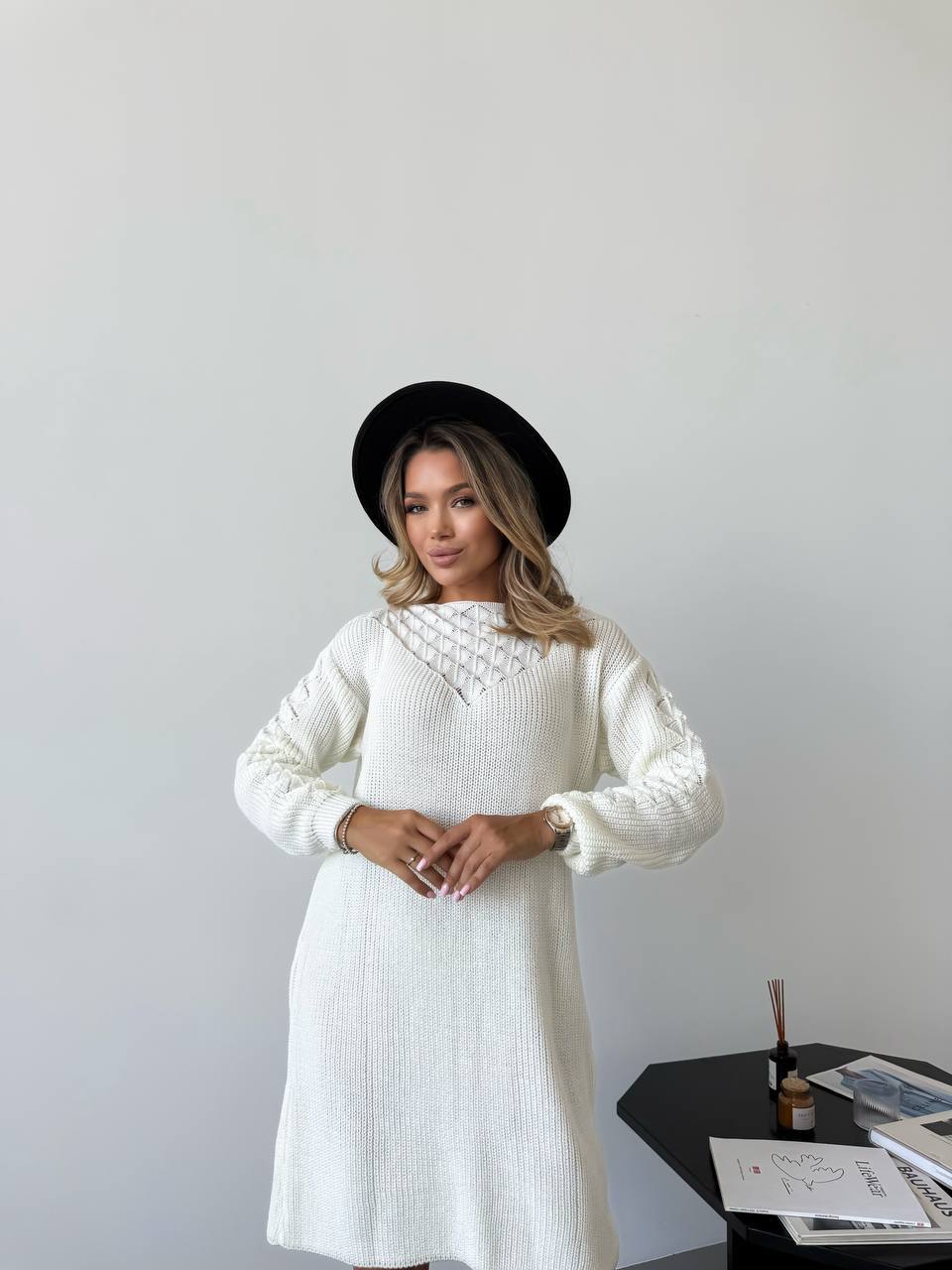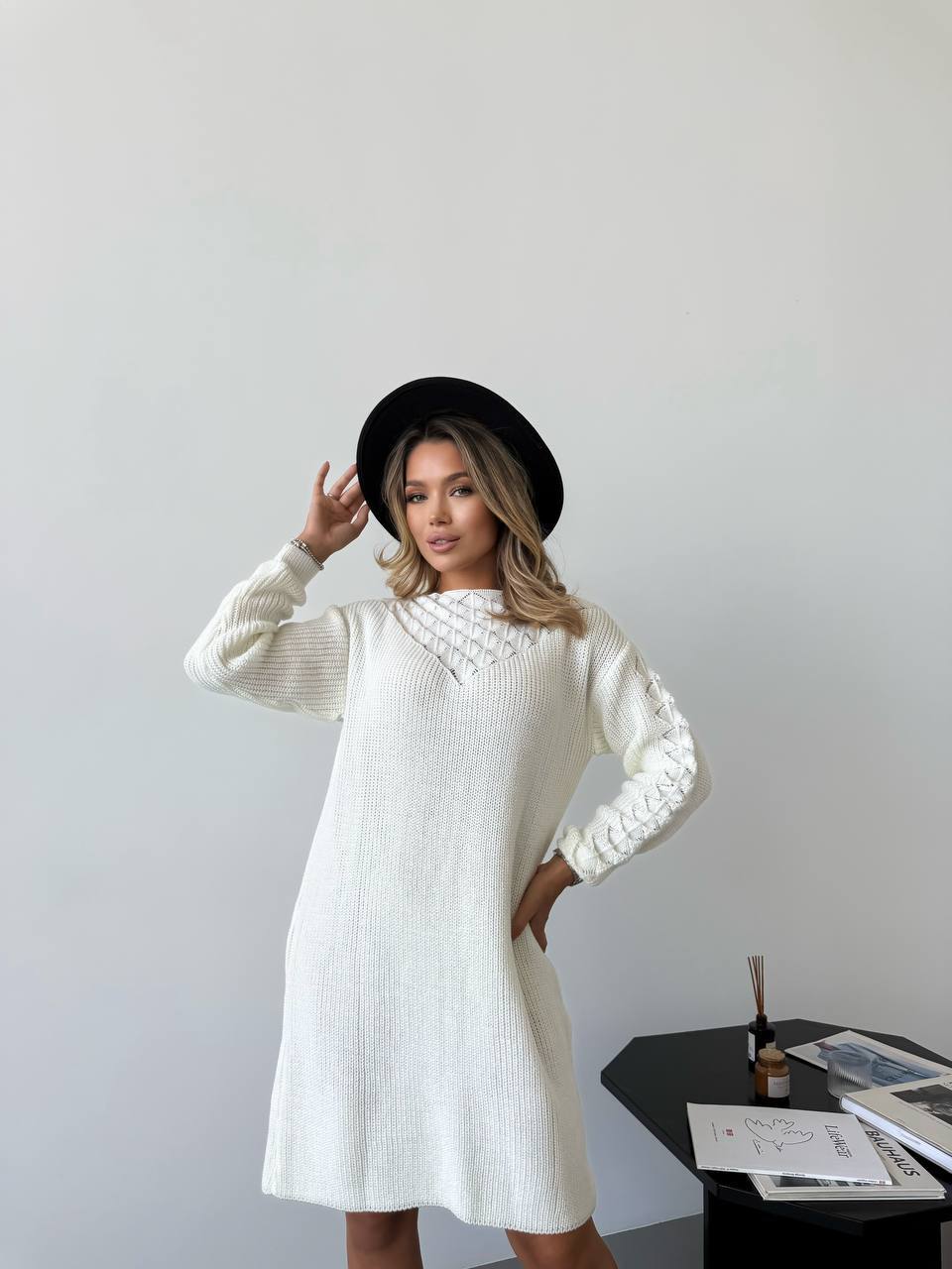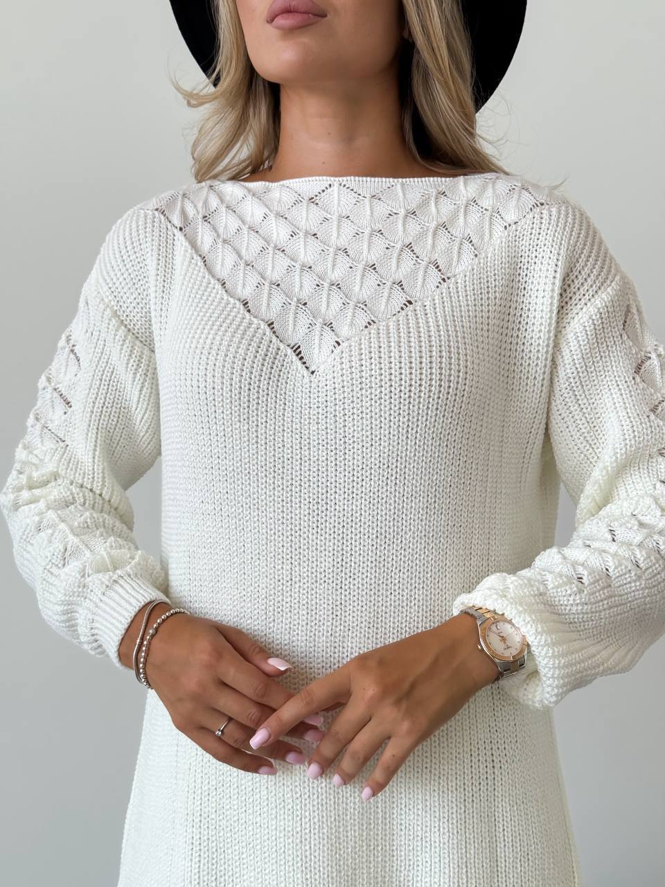 Жіноча в’язана сукня з візерунком молочного кольору 00565