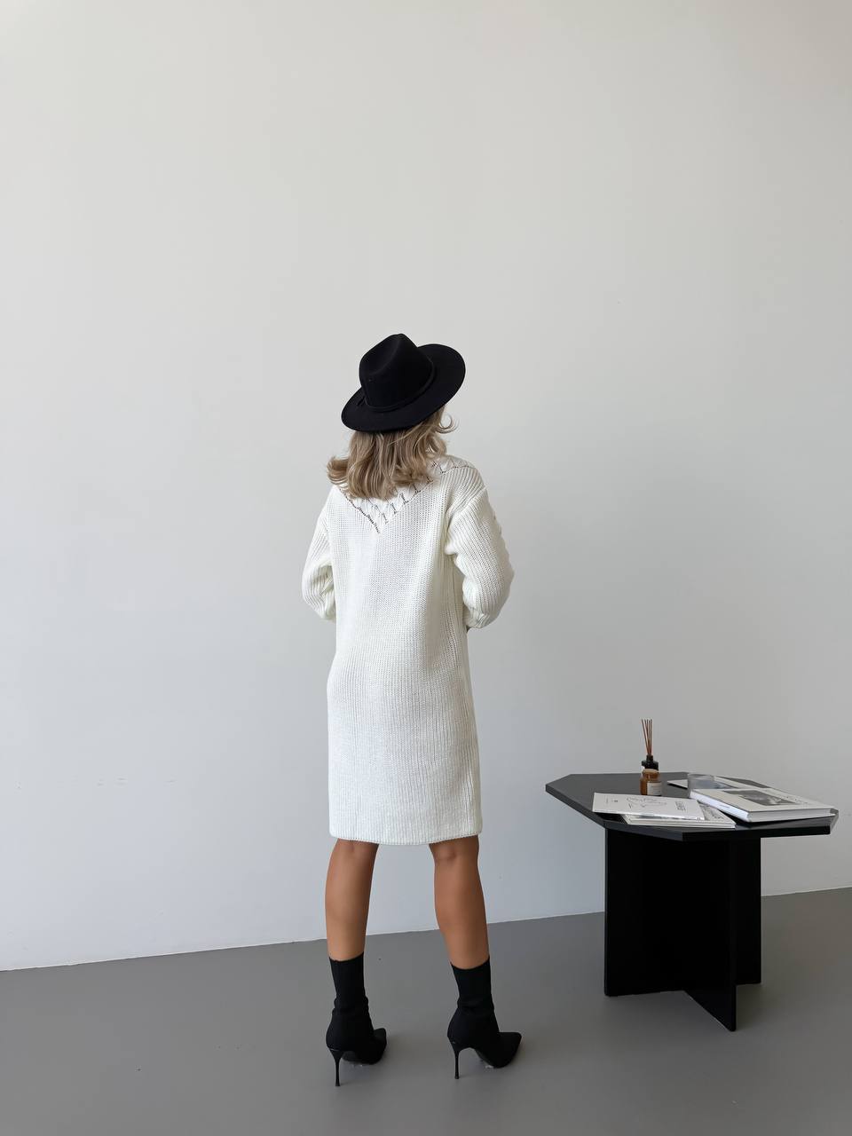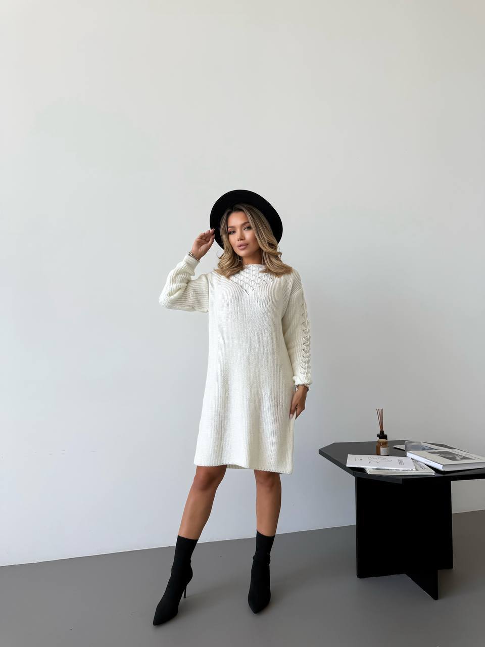 Модель виконана у довжині до колін, що робить її універсальним варіантом як для повсякденних образів, так і для роботи чи зустрічей. В’язаний візерунок додає виробу фактурності та робить образ більш виразним. Сукню легко поєднувати з чоботами, черевиками або класичним пальтом.