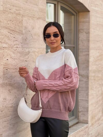 Жіночий в’язаний светр з низьким горлом молоко-світла пудра-темна пудра 00394