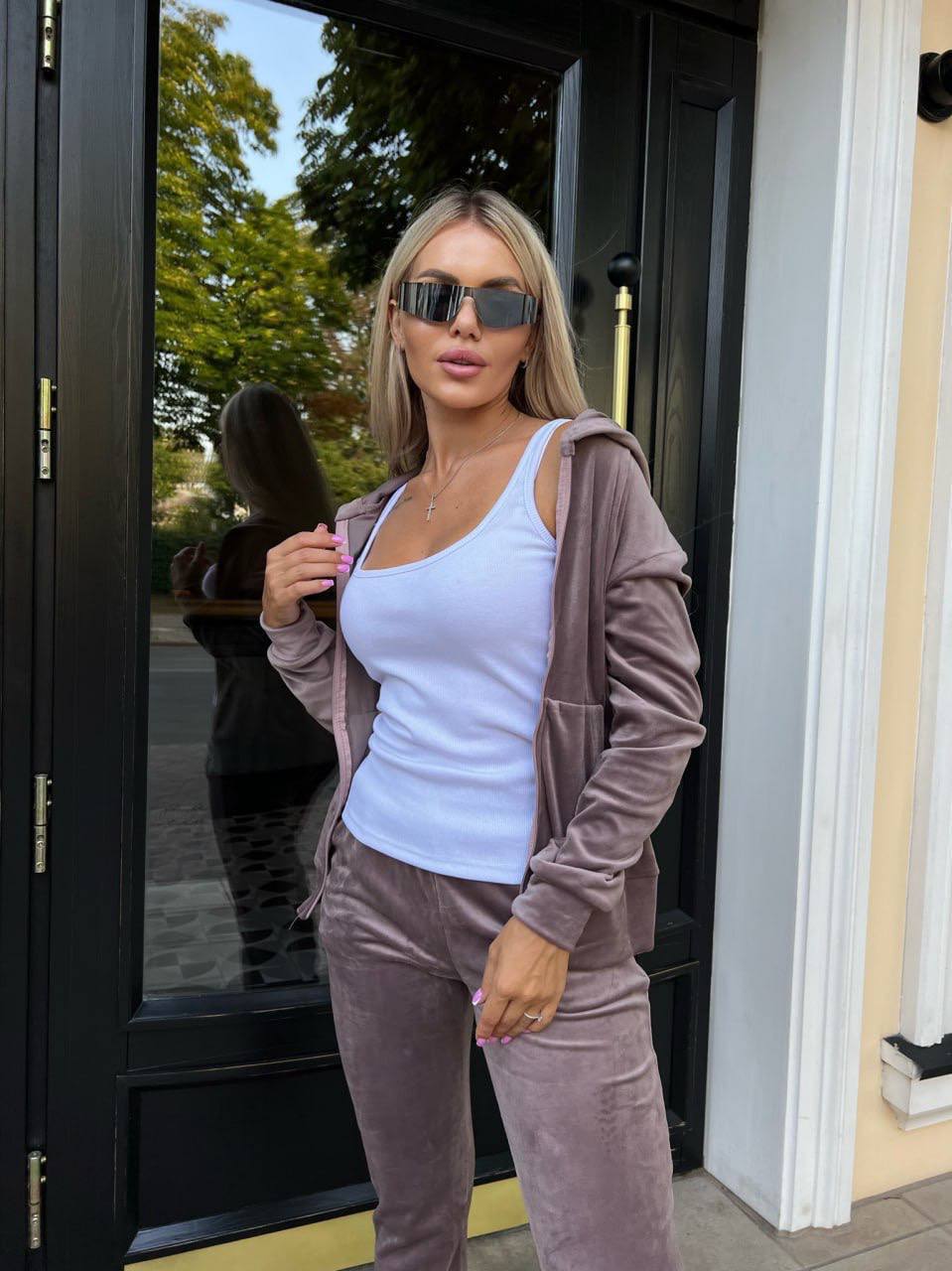На фото модель виглядає сучасно та лаконічно: акуратна посадка, зручний крій і мінімалістичний дизайн роблять костюм універсальним варіантом для прогулянок, подорожей та повсякденних образів.