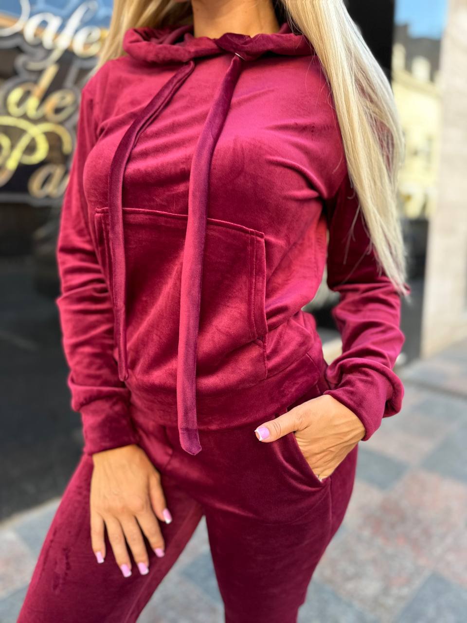 Додати до відстеження цінЖіночій спортивний велюровий костюм бордового кольору — стильний велюровий комплект у спортивно-casual стилі. Модель складається з худі з капюшоном та зручних штанів на резинці. Завдяки м’якій, еластичній тканині костюм приємний до тіла, красиво сідає по фігурі та забезпечує максимальний комфорт у русі. Ідеальний варіант для прогулянок, подорожей та повсякденних образів у прохолодну погоду.