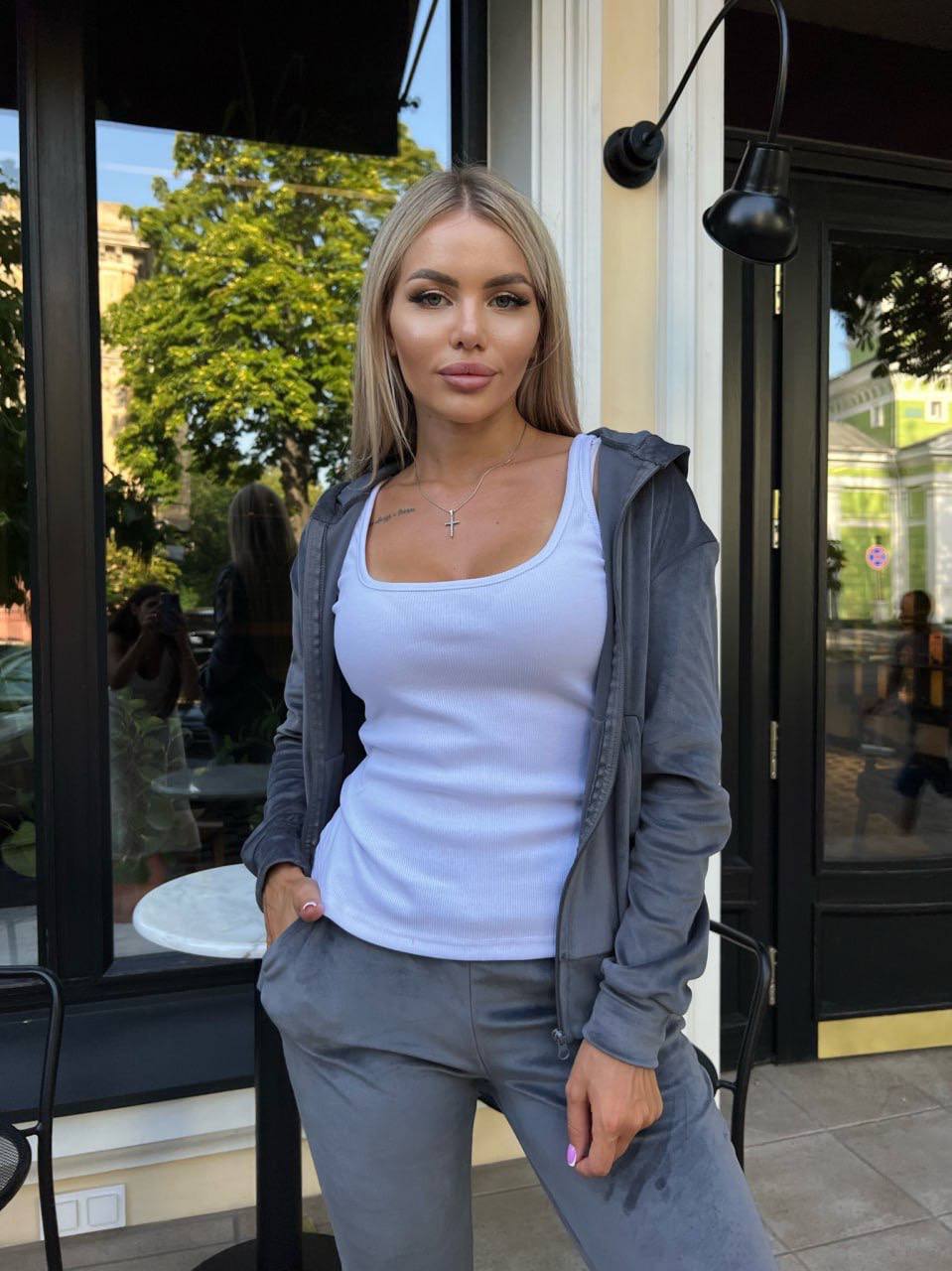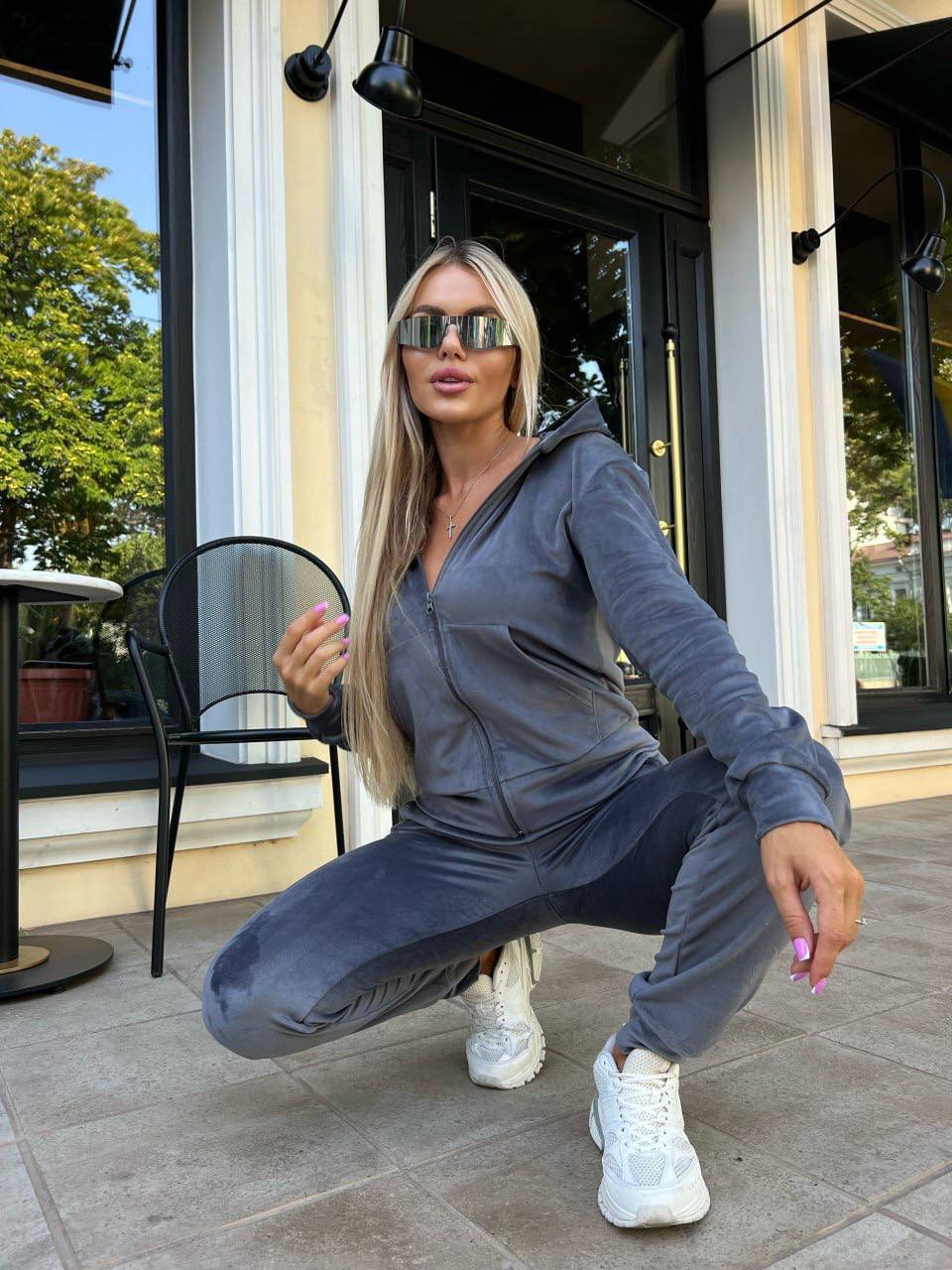 На фото модель виглядає сучасно та лаконічно: акуратна посадка, зручний крій і мінімалістичний дизайн роблять костюм універсальним варіантом для прогулянок, подорожей та повсякденних образів.