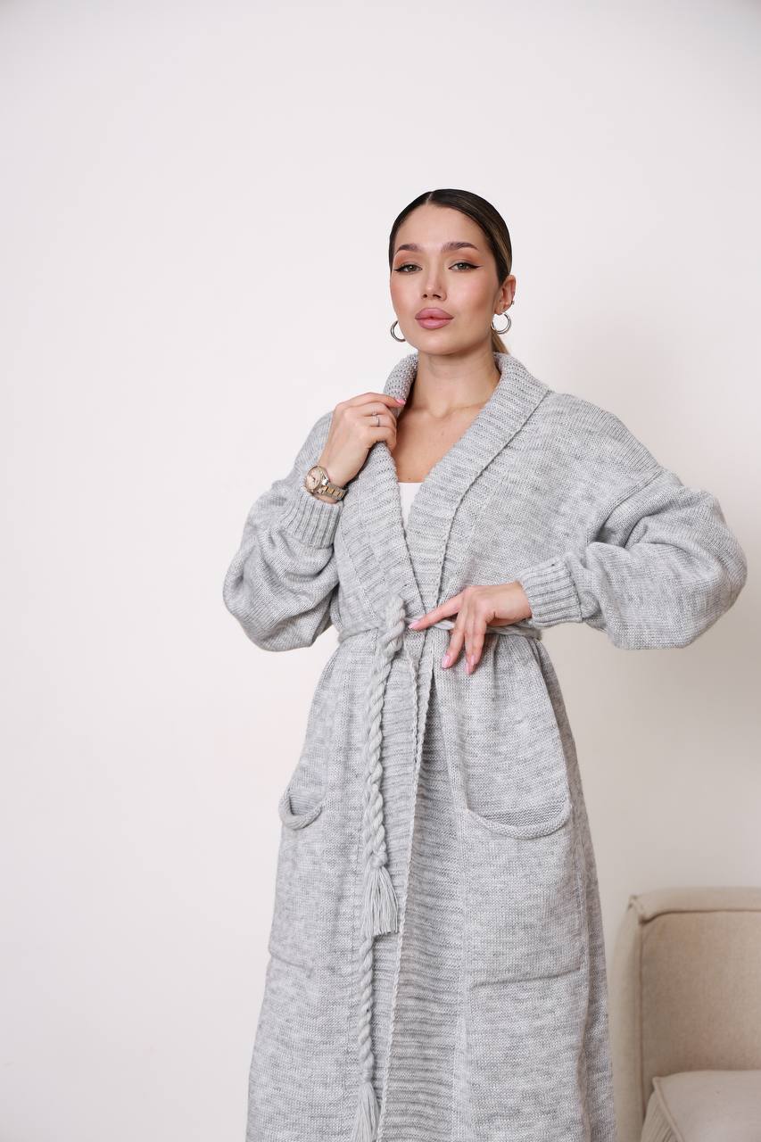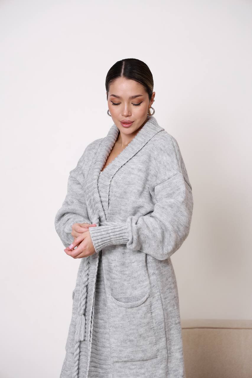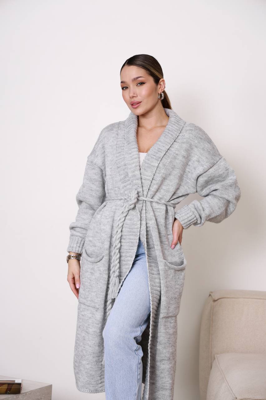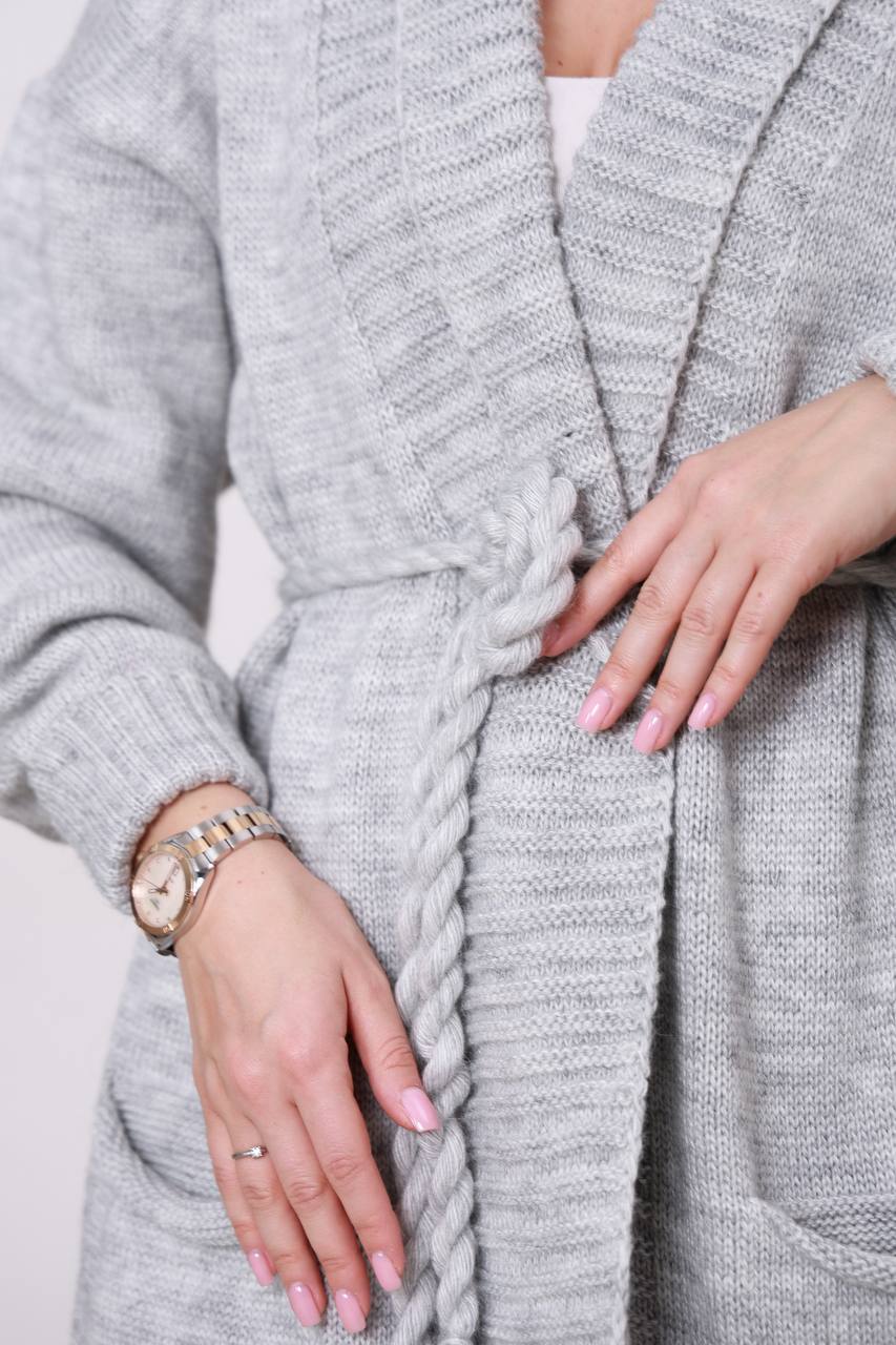 Жіночий кардиган з плетеним поясом сірого кольору – поєднує елегантність, комфорт і практичність. Модель має лаконічний дизайн із широким в’язаним коміром та поясом, що красиво підкреслює силует і дозволяє регулювати посадку. Завдяки довжині кардиган виглядає особливо стильно та додає образу витонченості.