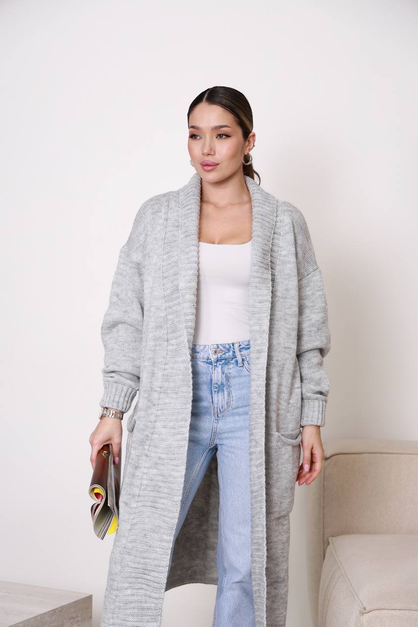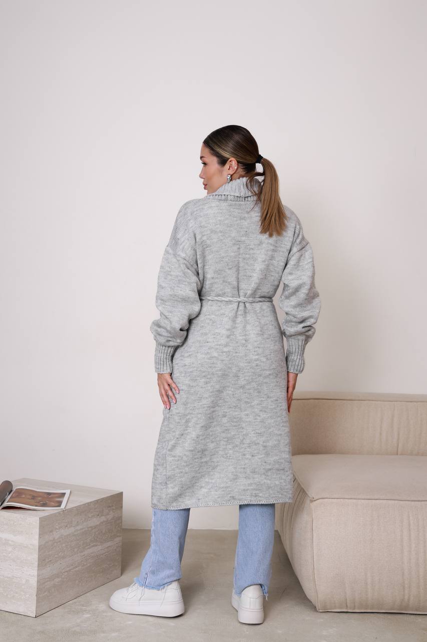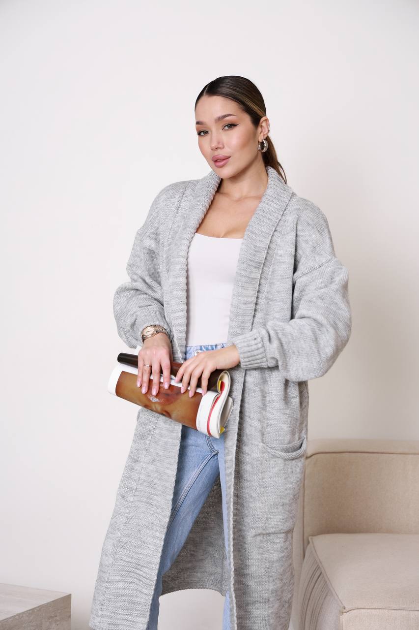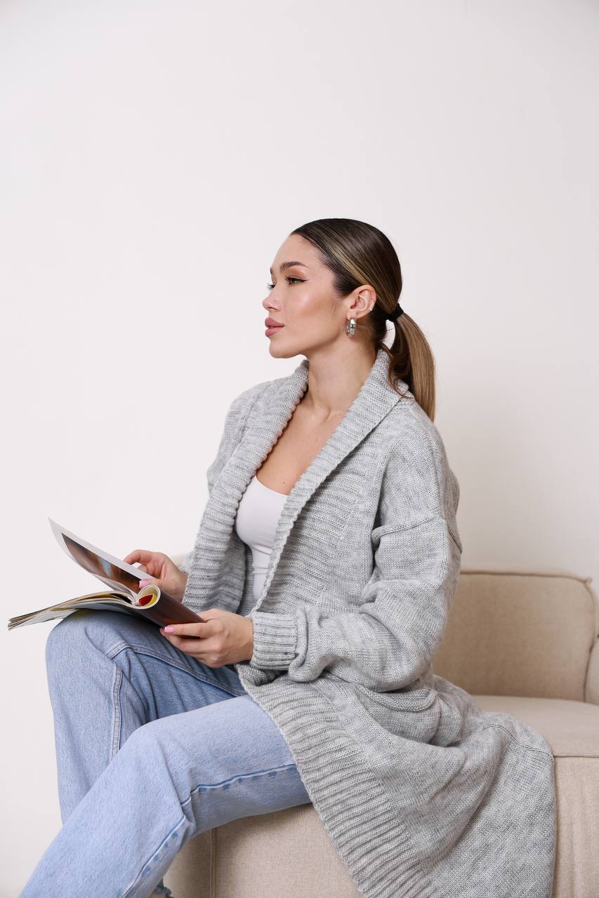 Жіночий кардиган з плетеним поясом сірого кольору – поєднує елегантність, комфорт і практичність. Модель має лаконічний дизайн із широким в’язаним коміром та поясом, що красиво підкреслює силует і дозволяє регулювати посадку. Завдяки довжині кардиган виглядає особливо стильно та додає образу витонченості.