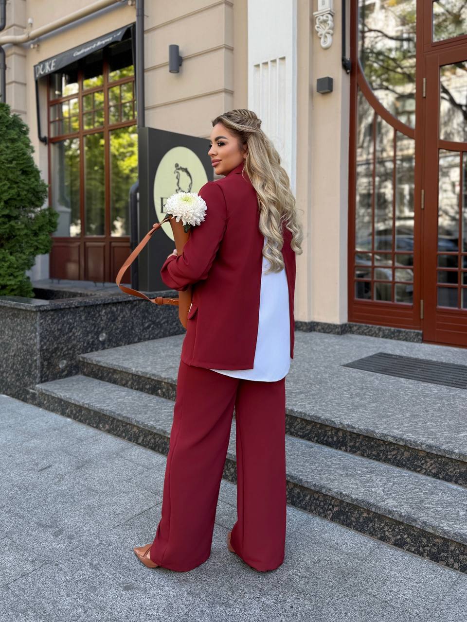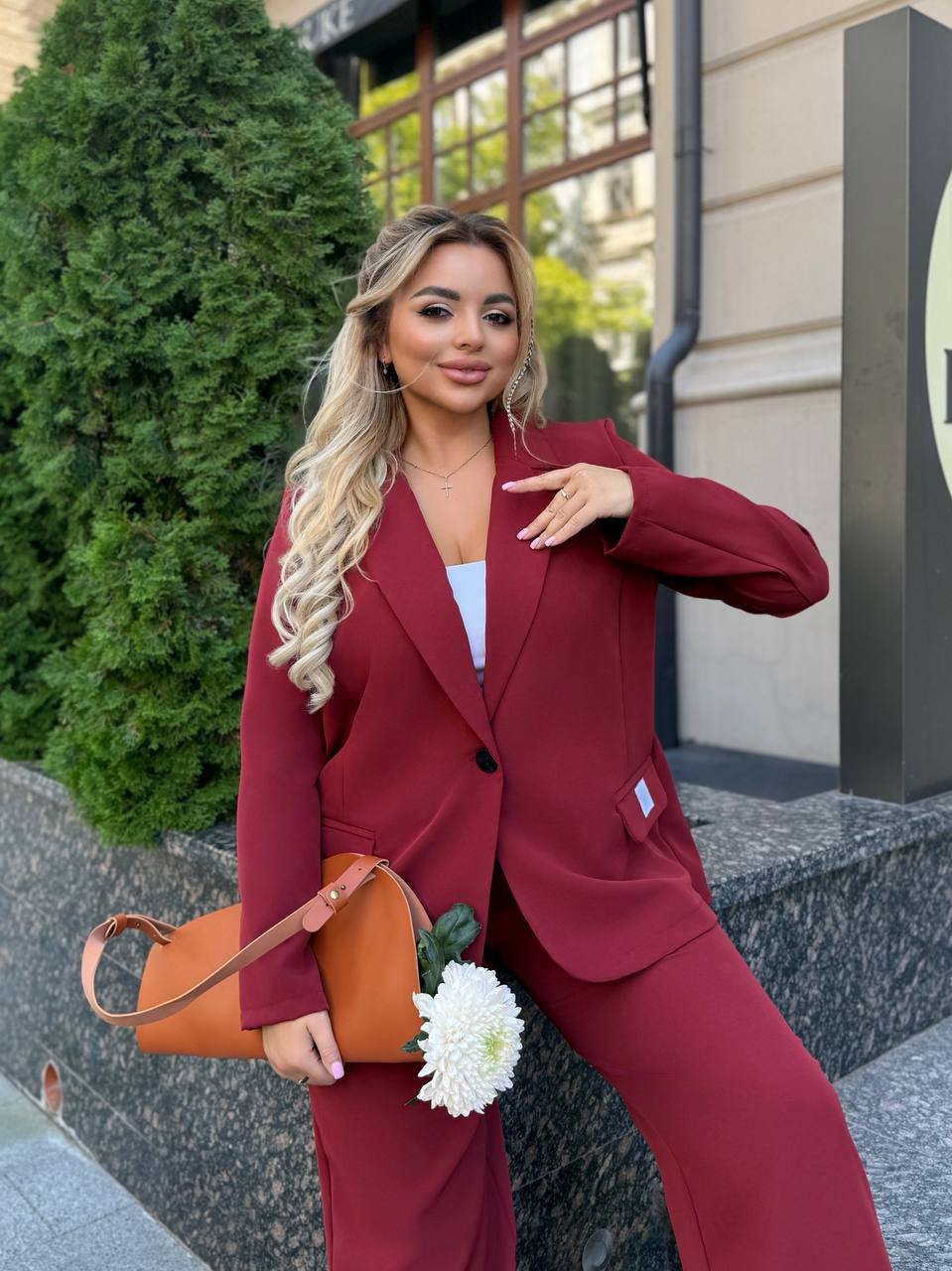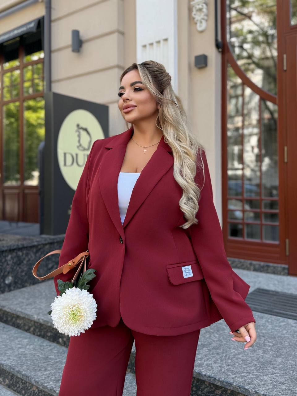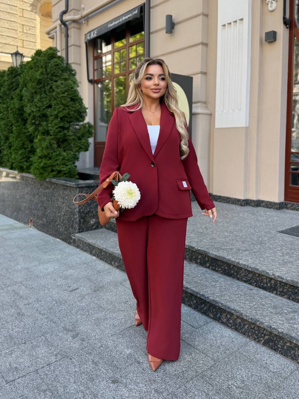 На фото модель виглядає стильно та впевнено: ніжний бордовий відтінок додає образу свіжості, класичний крій піджака підкреслює лінію плечей, а вільні штани формують елегантний силует. Ідеальний варіант для жінок, які цінують комфорт і витонченість.