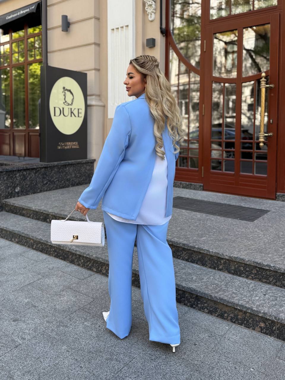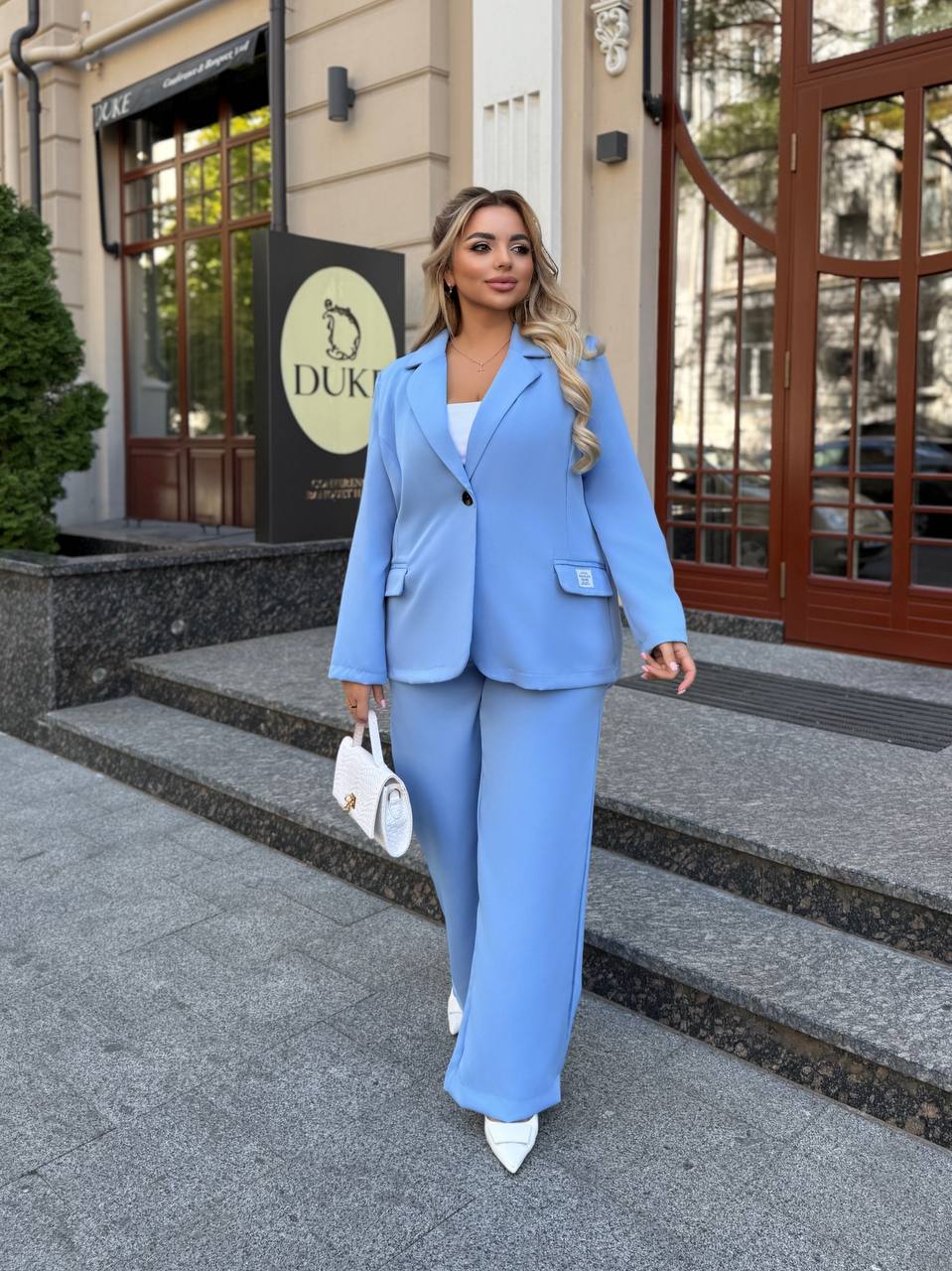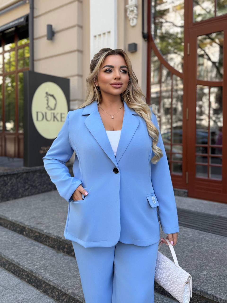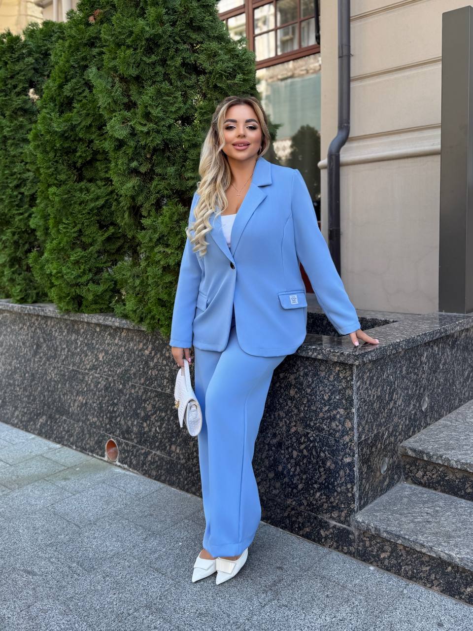На фото модель виглядає стильно та впевнено: ніжний блакитний відтінок додає образу свіжості, класичний крій піджака підкреслює лінію плечей, а вільні штани формують елегантний силует. Ідеальний варіант для жінок, які цінують комфорт і витонченість.