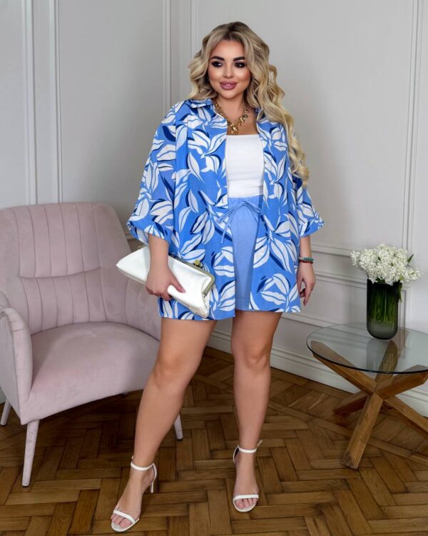 Костюм складається із подовженої сорочки з принтом на ґудзиках та шортів. Сорочка має вільний крій і довгий рукав, що додає образу легкості та універсальності — її можна носити як самостійно, так і накидати поверх топу. Шорти з високою посадкою мають пояс на резинці зі шнурком, що дозволяє регулювати посадку. Врізні кармани додають практичності та зручності у повсякденному носінні.