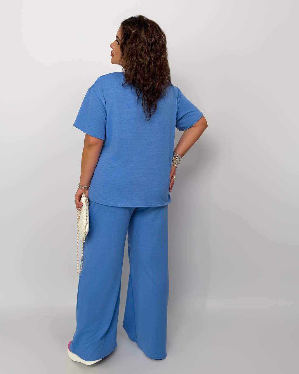 Костюм складається з вільної футболки та штанів. Завдяки свободному крою модель не сковує рухів та добре сідає на різні типи фігури. Футболка має комфортну довжину та подовжений рукав, що додає образу стильного вигляду. Штани з високою посадкою та поясом на резинці забезпечують зручну посадку, а врізні кармани додають практичності.