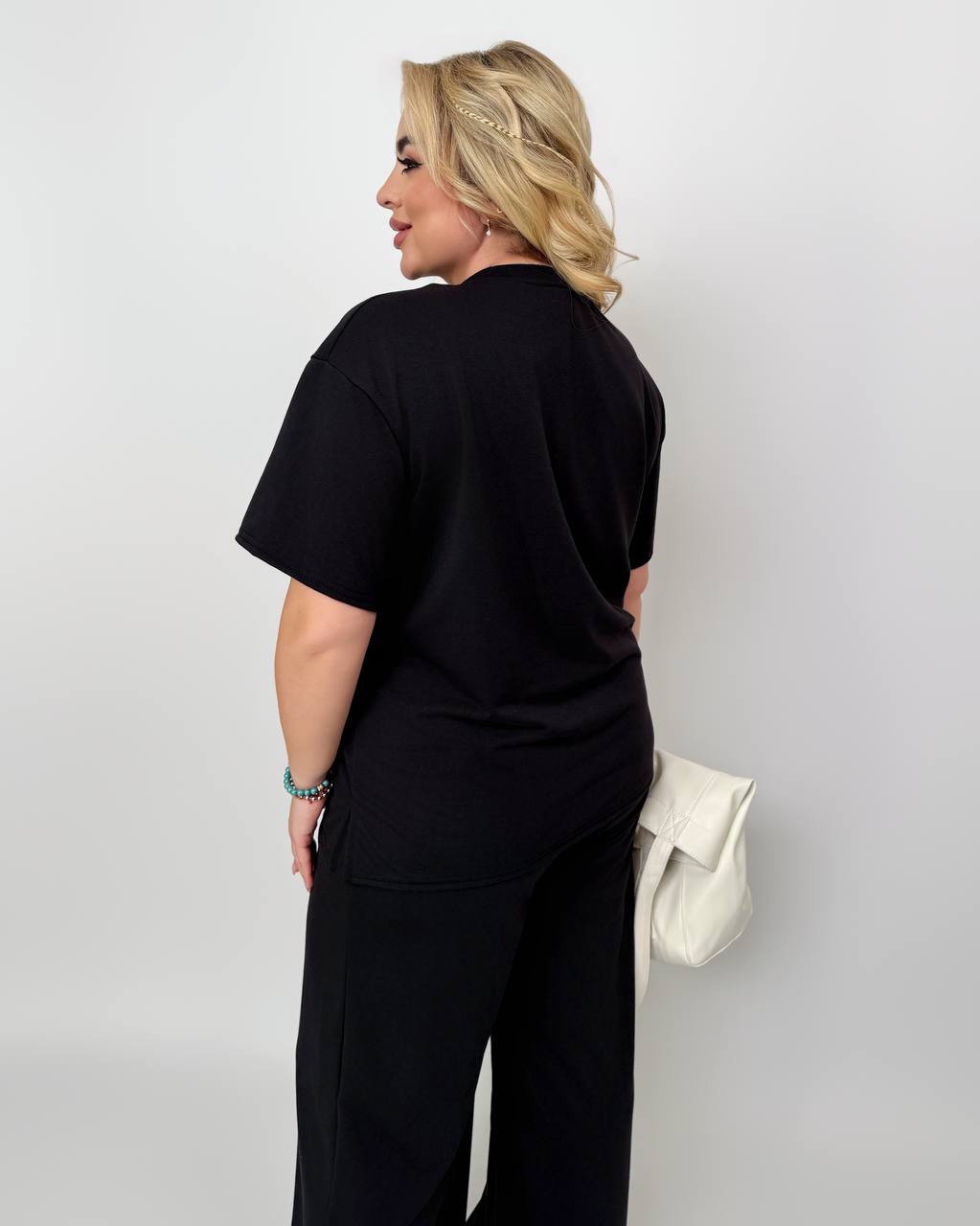 Костюм складається з вільної футболки та штанів. Завдяки свободному крою модель не сковує рухів та добре сідає на різні типи фігури. Футболка має комфортну довжину та подовжений рукав, що додає образу стильного вигляду. Штани з високою посадкою та поясом на резинці забезпечують зручну посадку, а врізні кармани додають практичності.