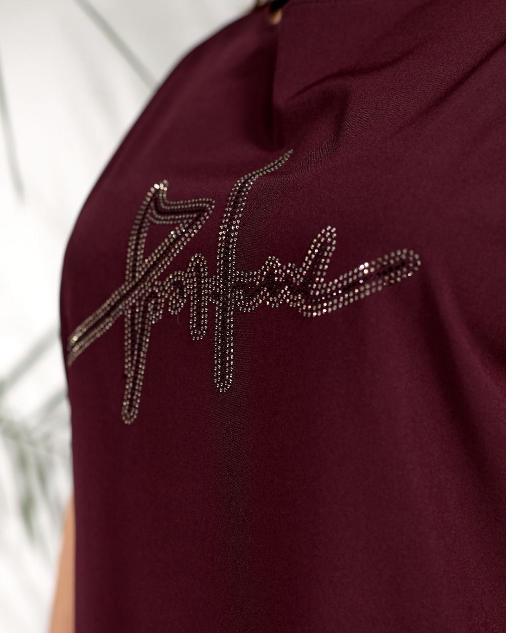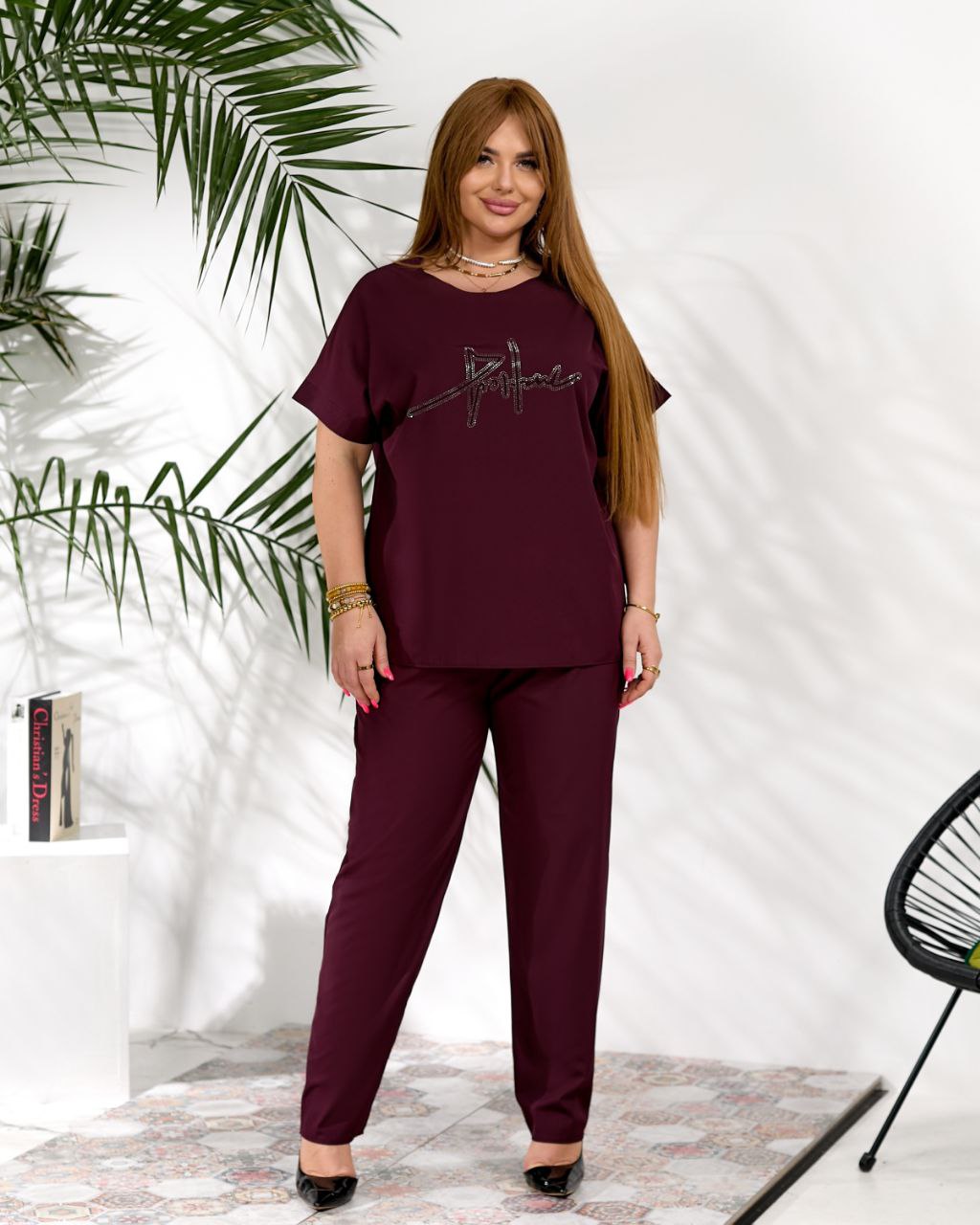 Жіночий стильний костюм з надписом із стразів бордового кольору 00634
