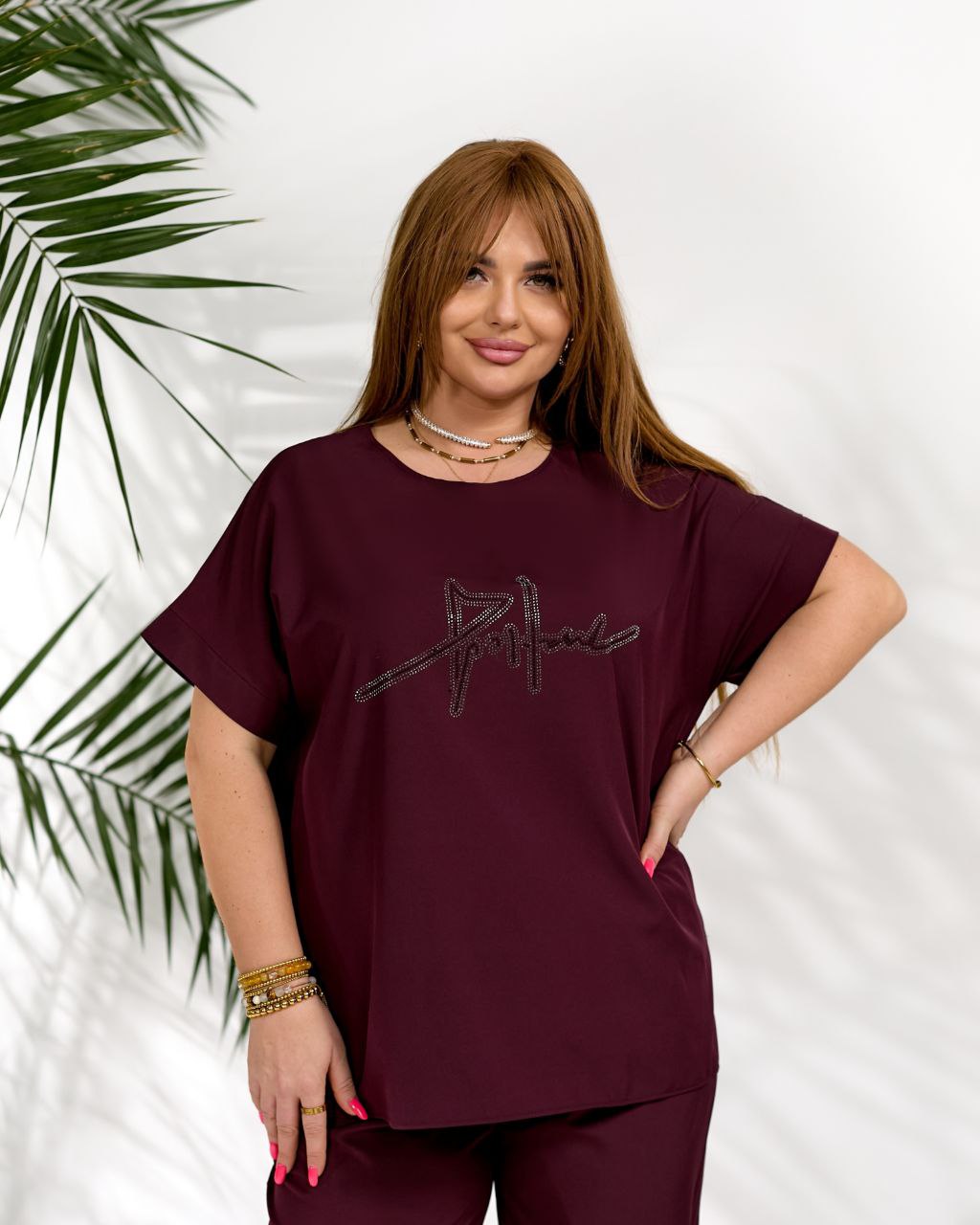Додати до відстеження цінЖіночий стильний костюм з надписом із стразів бордового кольору – який ідеально підходить для щоденного носіння, прогулянок або відпочинку. Модель виконана з легкої та приємної до тіла тканини софт, яка добре пропускає повітря, красиво виглядає та забезпечує комфорт протягом усього дня.