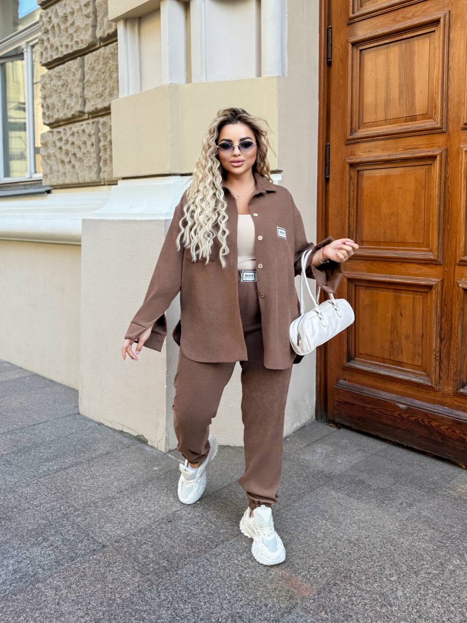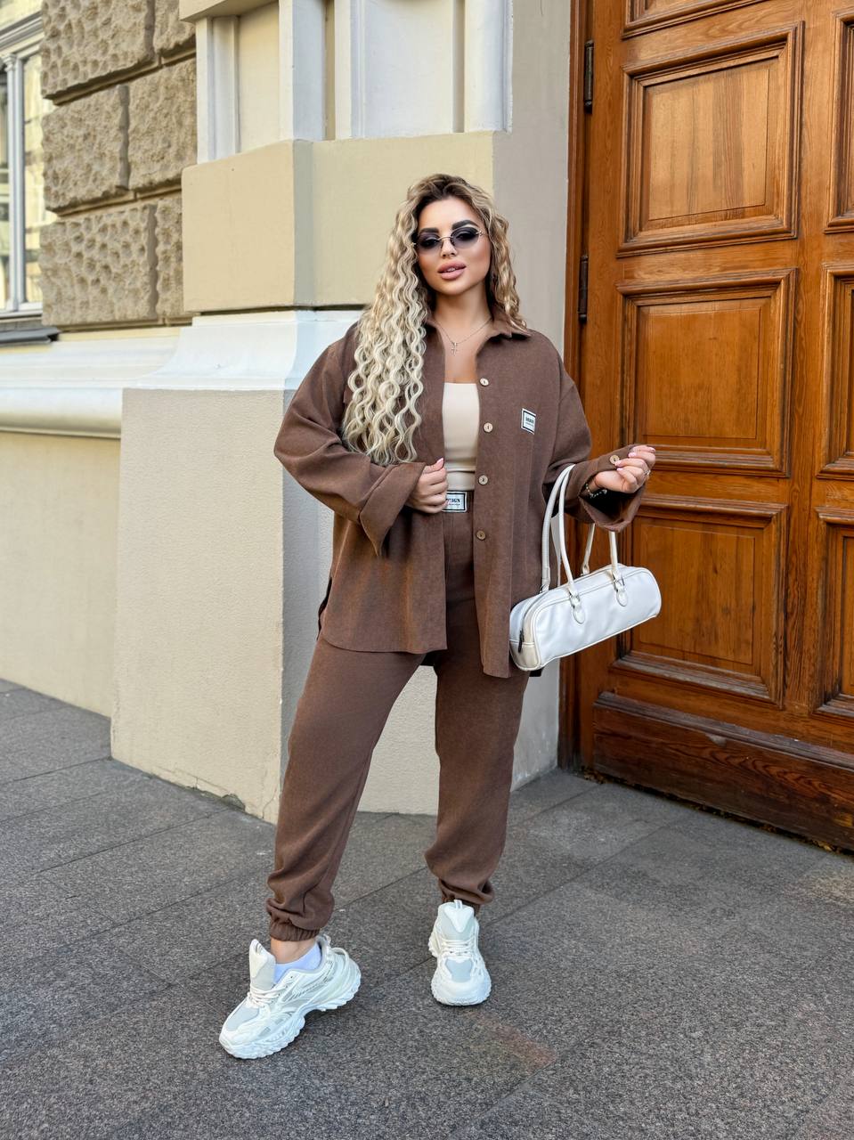 На фото модель виглядає стильно та гармонійно: подовжена сорочка з накладними кишенями та ґудзиками формує трендовий силует, а штани з манжетами на резинці додають образу динамічності та зручності. Комплект чудово підходить для прогулянок, зустрічей та активного міського ритму.