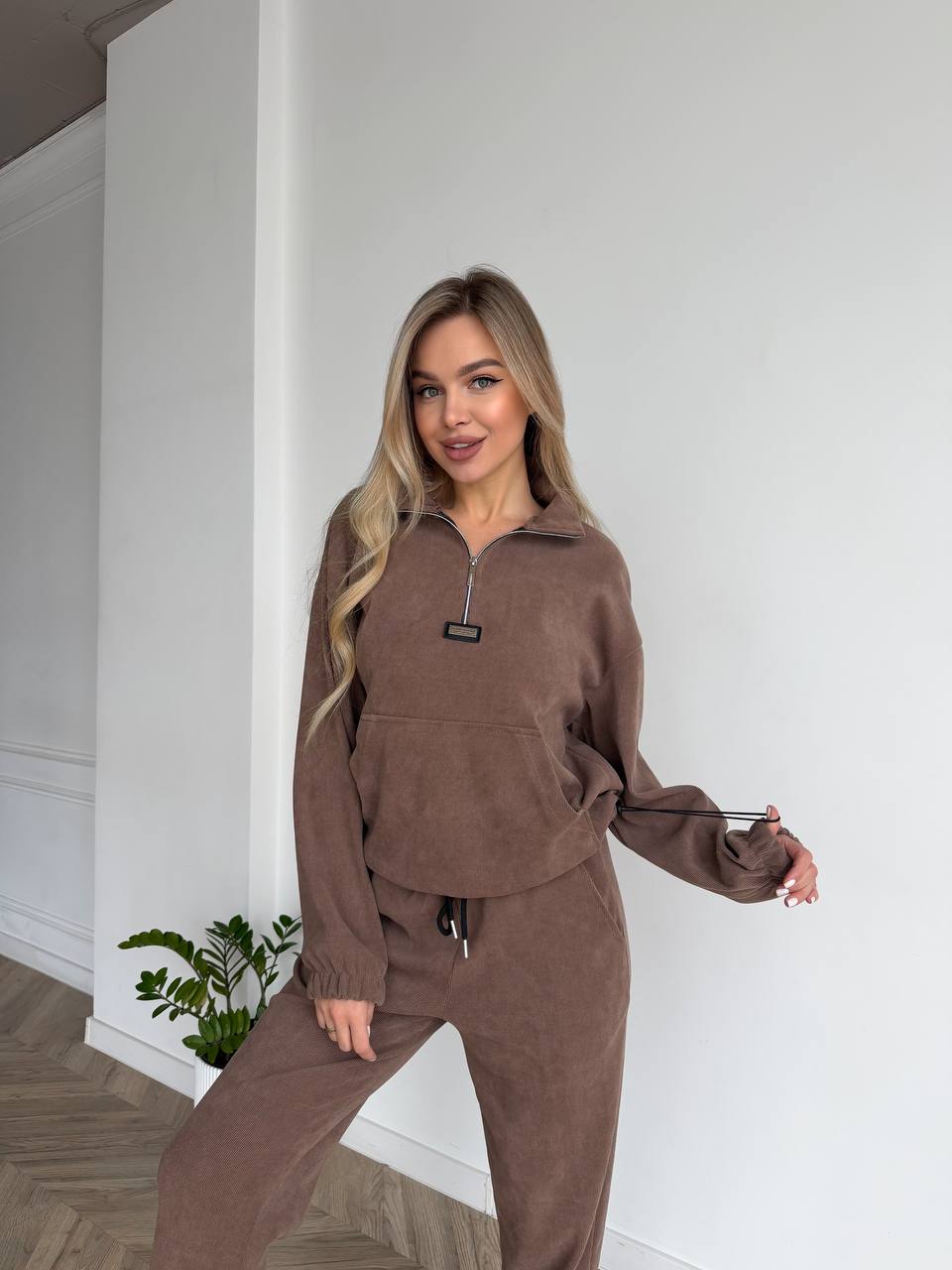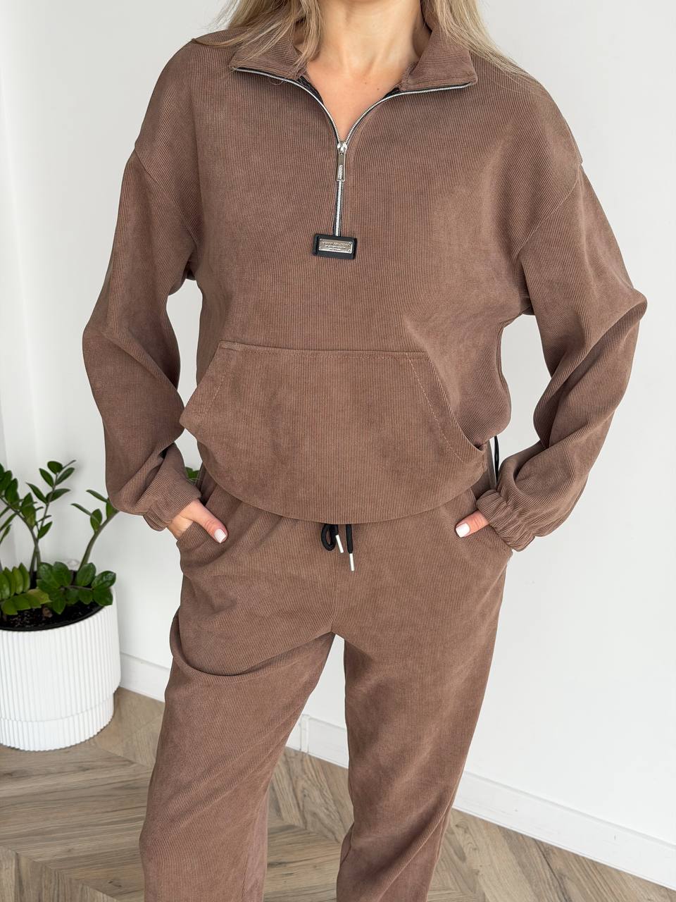 Жіночий костюм з вельвету бежевого кольору –  ідеально підходить для щоденного носіння, прогулянок або відпочинку. Модель виконана з якісної тканини трикотажний вільвет — м’якої, приємної до тіла та практичної у носінні. Матеріал добре тримає форму, виглядає стильно та забезпечує комфорт протягом усього дня.