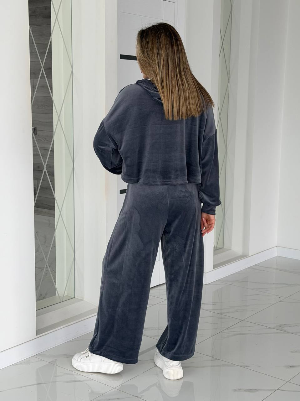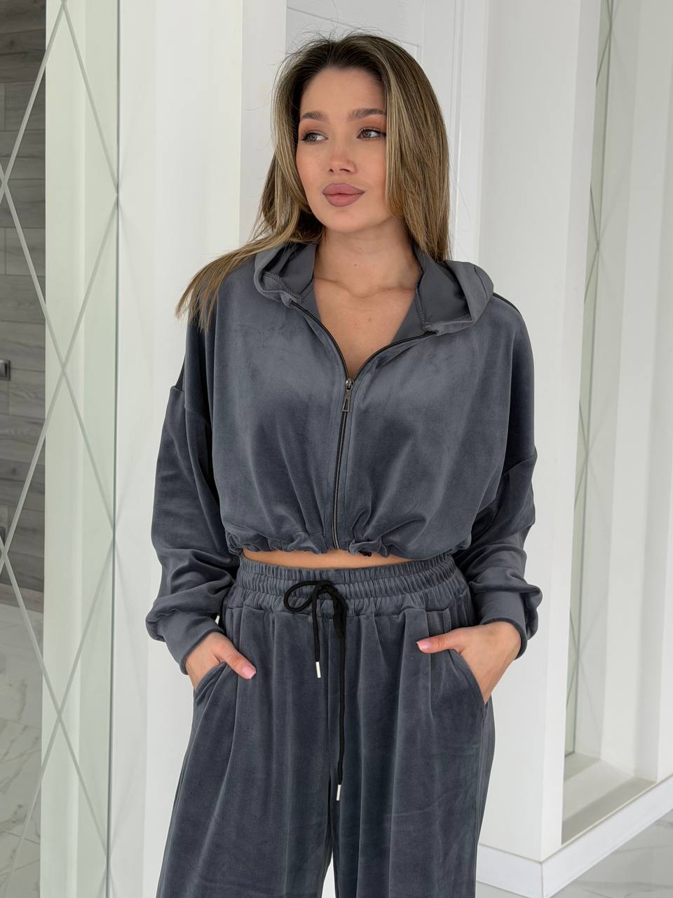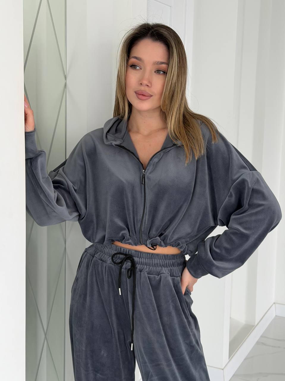 Жіночий костюм з велюру кольору графіт – ідеально підходить для щоденного носіння, прогулянок або подорожей. Модель виконана з м’якої та приємної до тіла тканини велюр, яка красиво виглядає, добре тримає форму та забезпечує максимальний комфорт протягом усього дня.