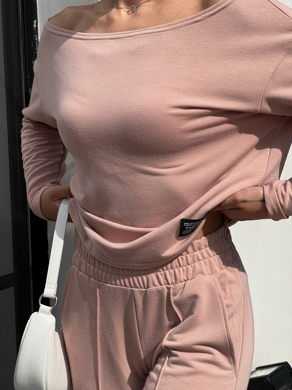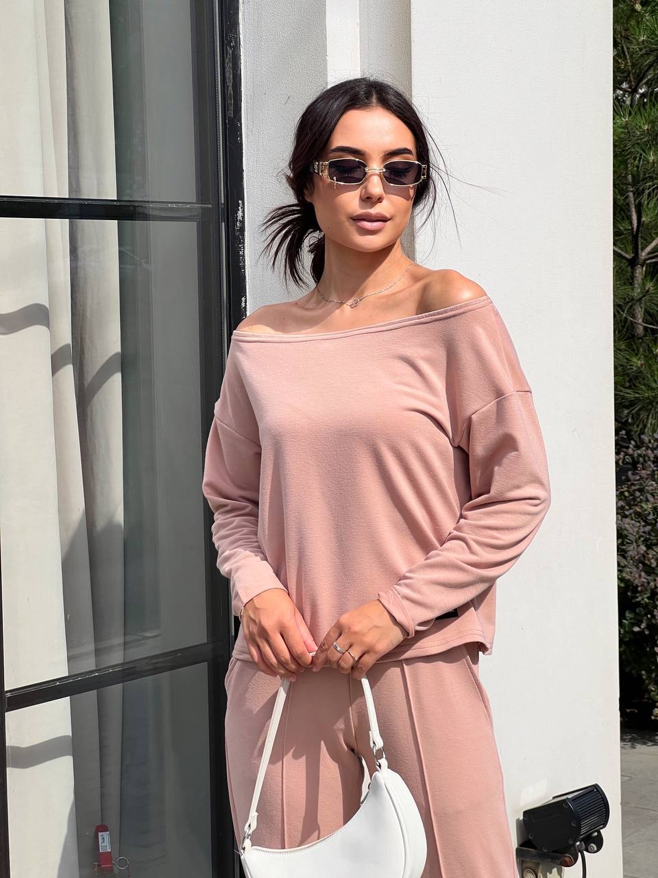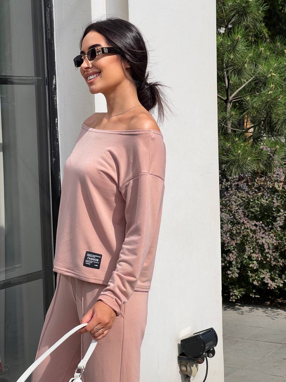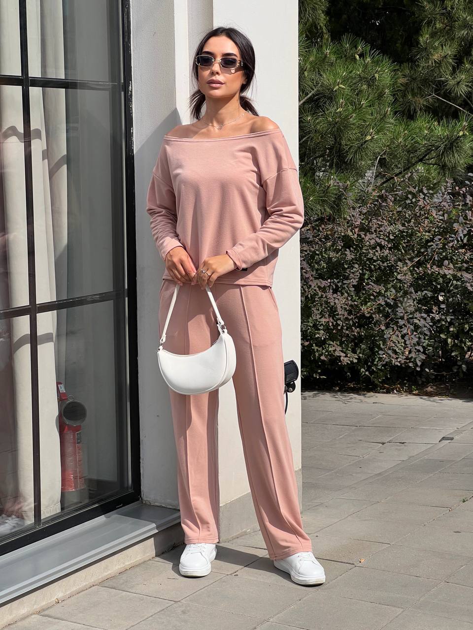 Жіночий костюм зі спущеним плечем бежевого кольору 00504