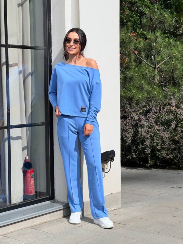 Жіночий костюм зі спущеним плечем синього кольору 00503