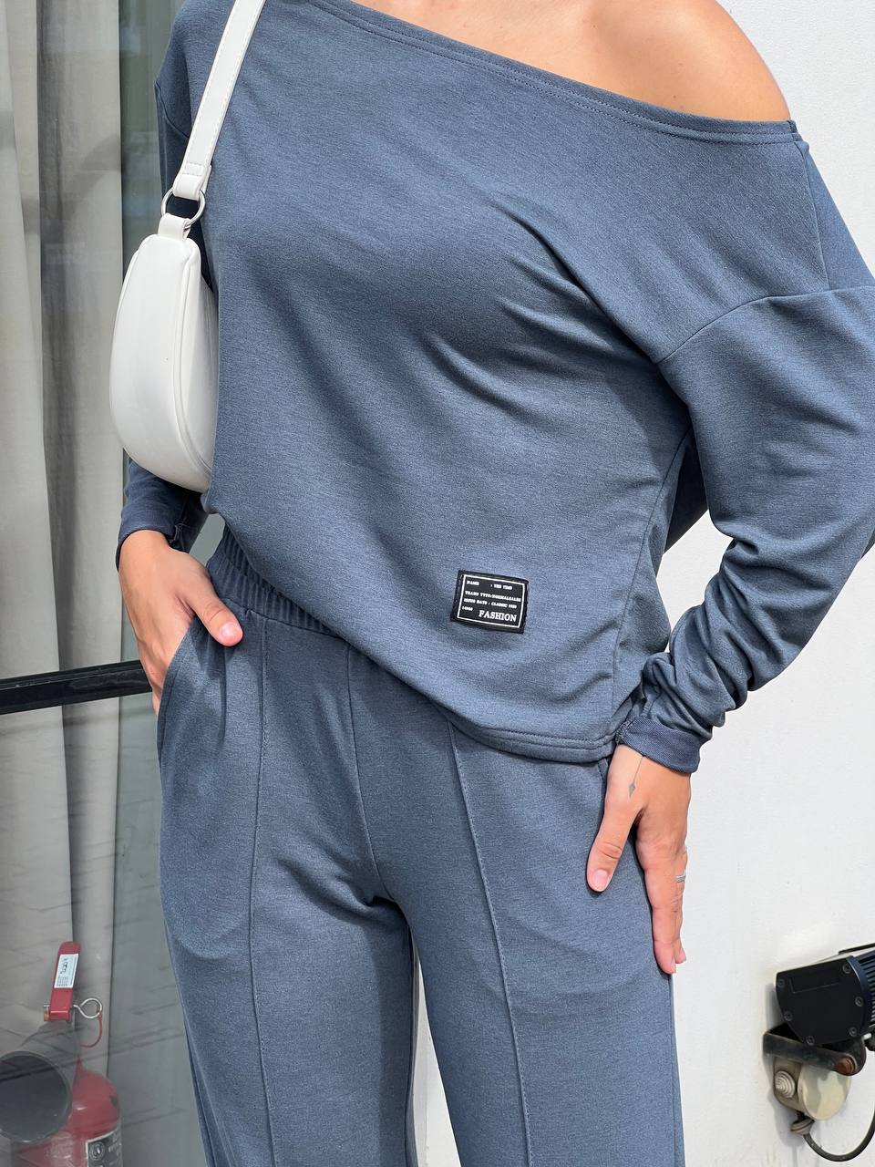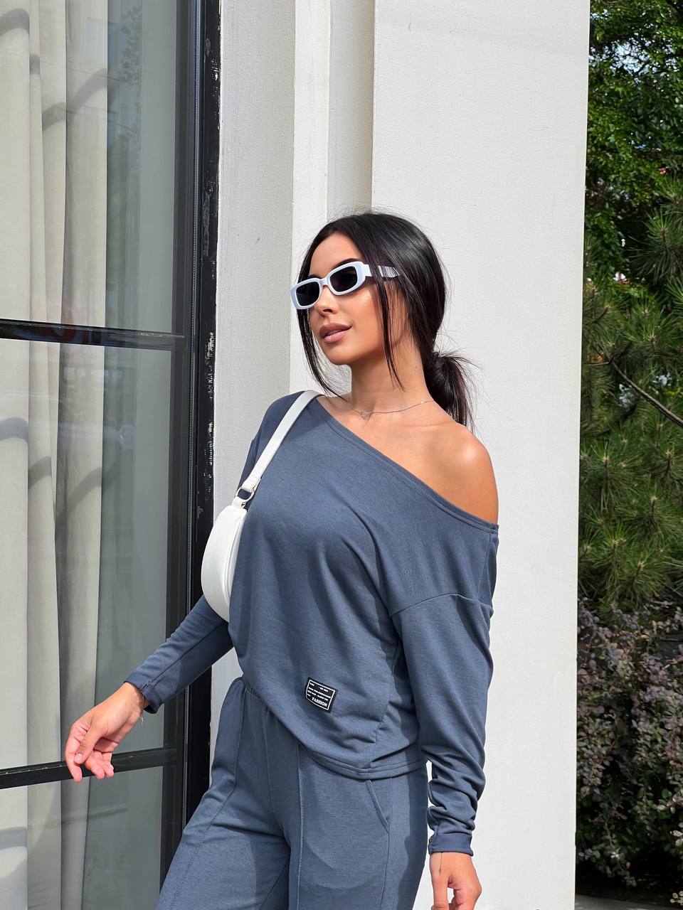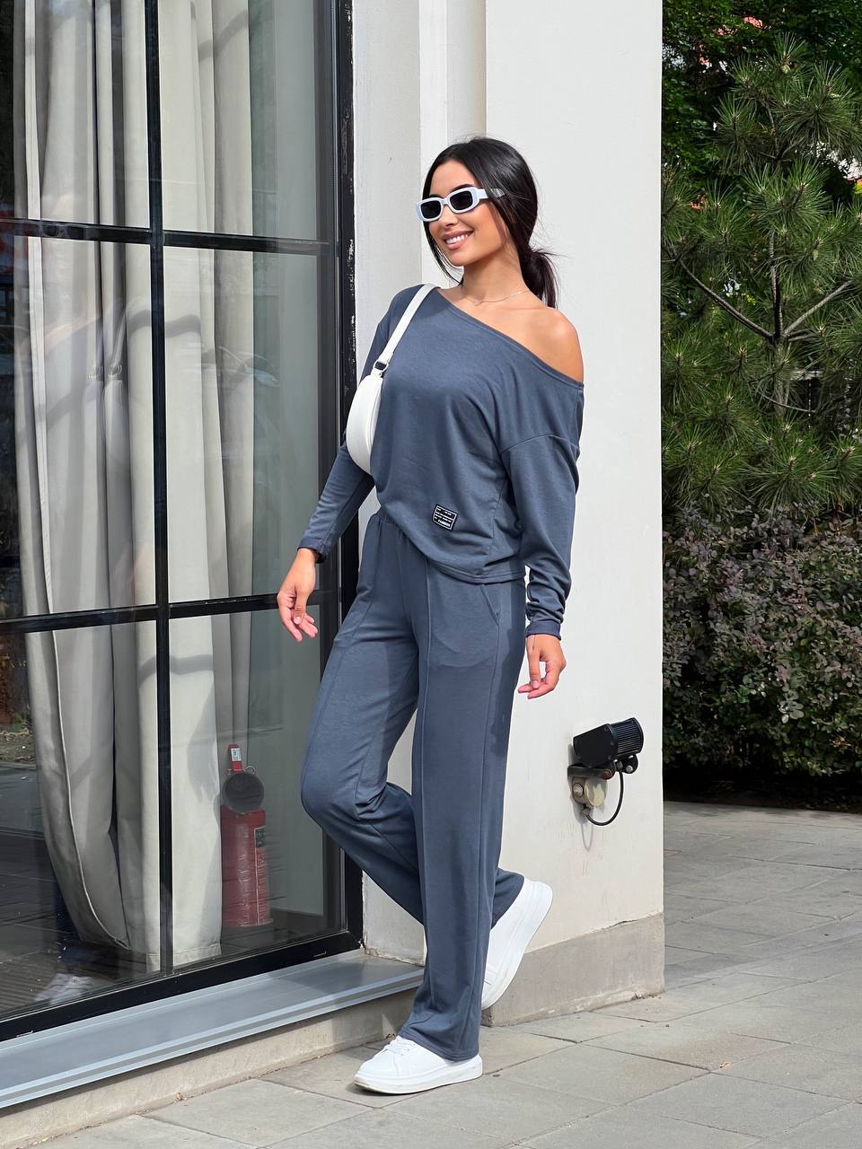 Жіночий костюм зі спущеним плечем графітового кольору 00505