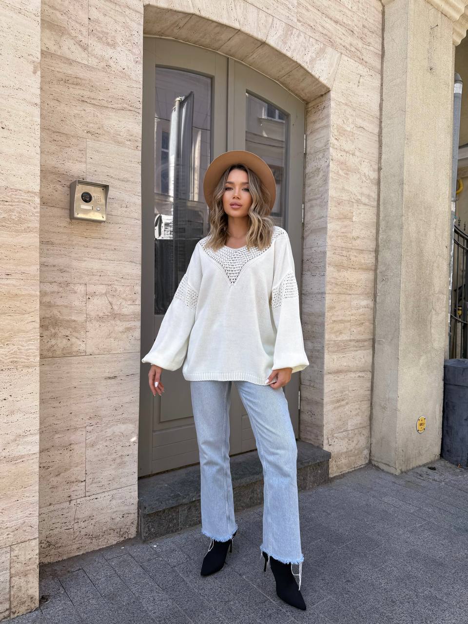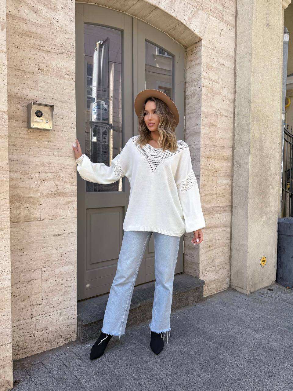 На фото модель виглядає ніжно та сучасно: вільний крій красиво сідає по фігурі, не облягає та забезпечує комфорт у русі. Довгий рукав формує гармонійний силует. Светр ідеально підходить для багатошарових образів — його можна носити під жакет, кардиган або легку куртку.