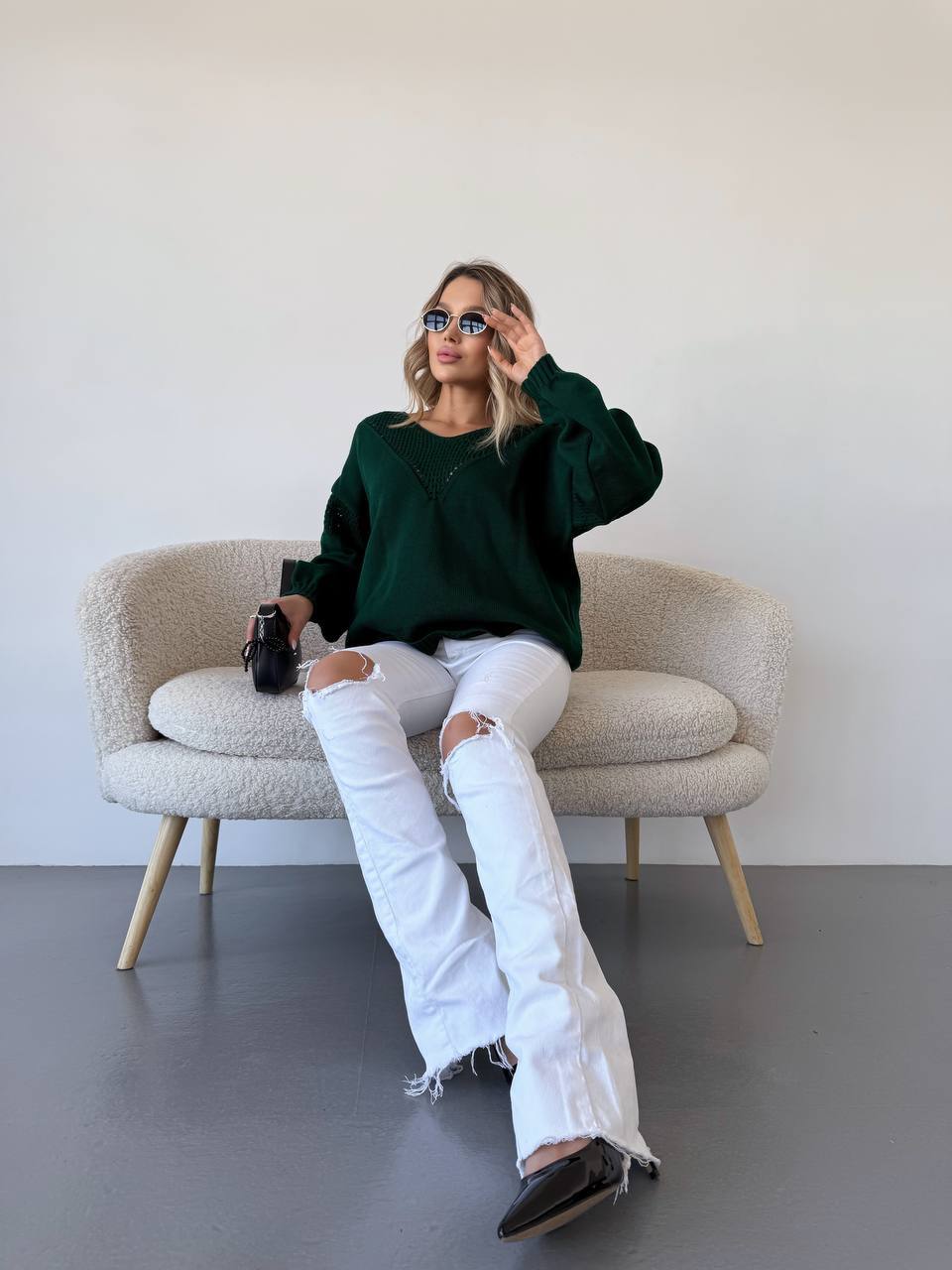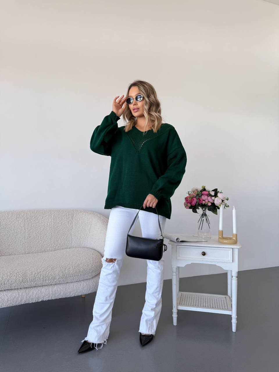На фото модель виглядає ніжно та сучасно: вільний крій красиво сідає по фігурі, не облягає та забезпечує комфорт у русі. Довгий рукав формує гармонійний силует. Светр ідеально підходить для багатошарових образів — його можна носити під жакет, кардиган або легку куртку.