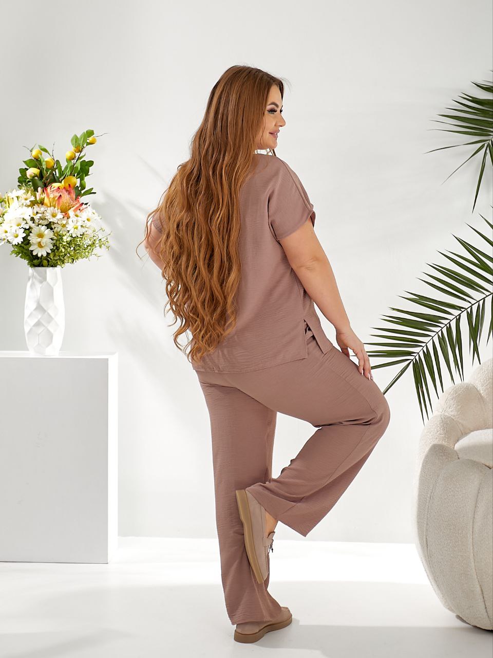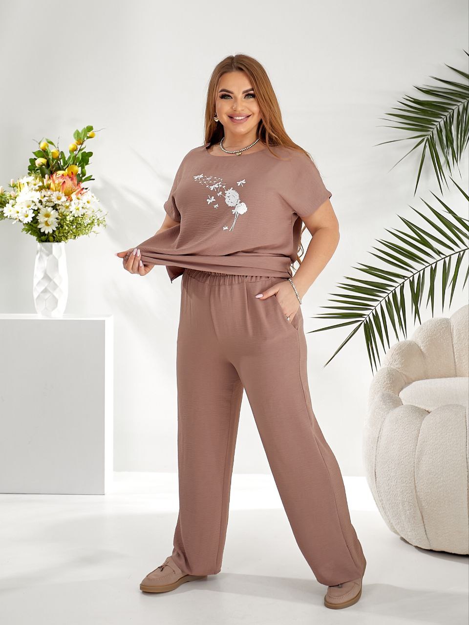 Костюм складається із зручної кофти з коротким рукавом та штанів. Кофта має вільний крій і сучасний дизайн, а штани оснащені поясом на резинці, що забезпечує зручну посадку. Модель відноситься до категорії великих розмірів (48+), що робить її ідеальним варіантом для жінок, які цінують стиль, комфорт та практичність.