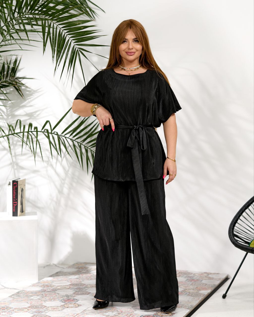 Жіночий стильний костюм з поясом чорного кольорут – чудово підходить для щоденного носіння, прогулянок або відпочинку. Модель виконана з легкої та приємної до тіла тканини гофре, яка має гарну фактуру, елегантно виглядає та забезпечує комфорт протягом усього дня.