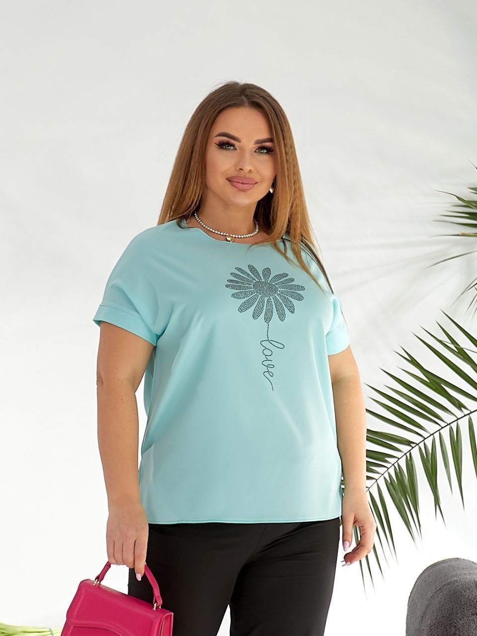 Жіночий стильний костюм з візерунком із стразів м’ятного кольору – ідеально підходить для щоденного носіння, прогулянок або відпочинку. Модель виконана з легкої та приємної до тіла тканини софт, яка добре пропускає повітря, красиво виглядає та забезпечує комфорт протягом усього дня.