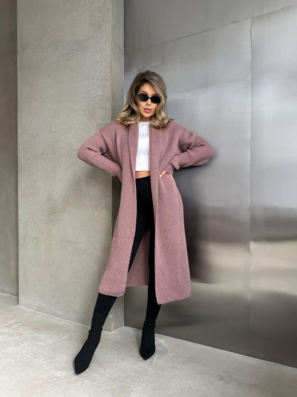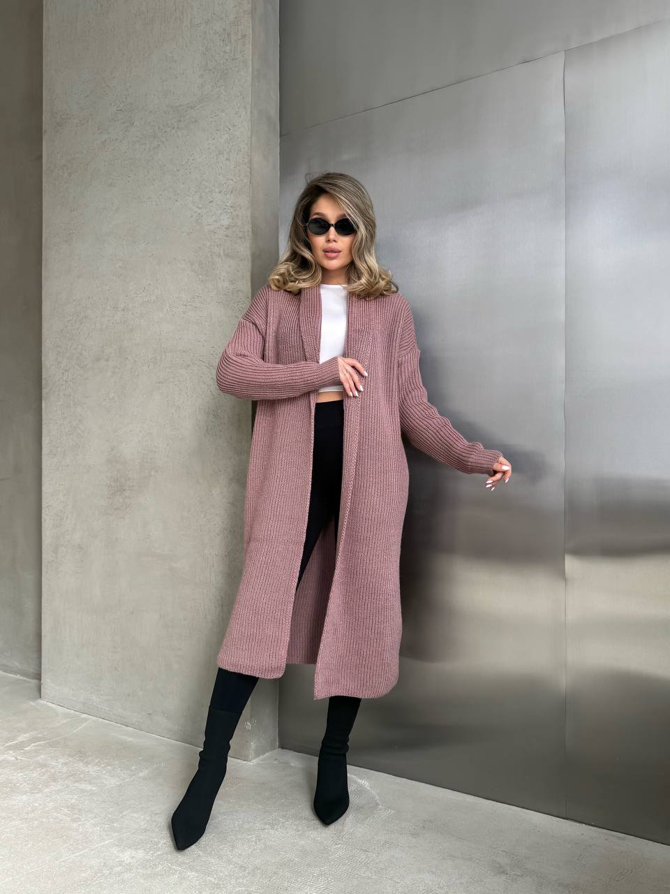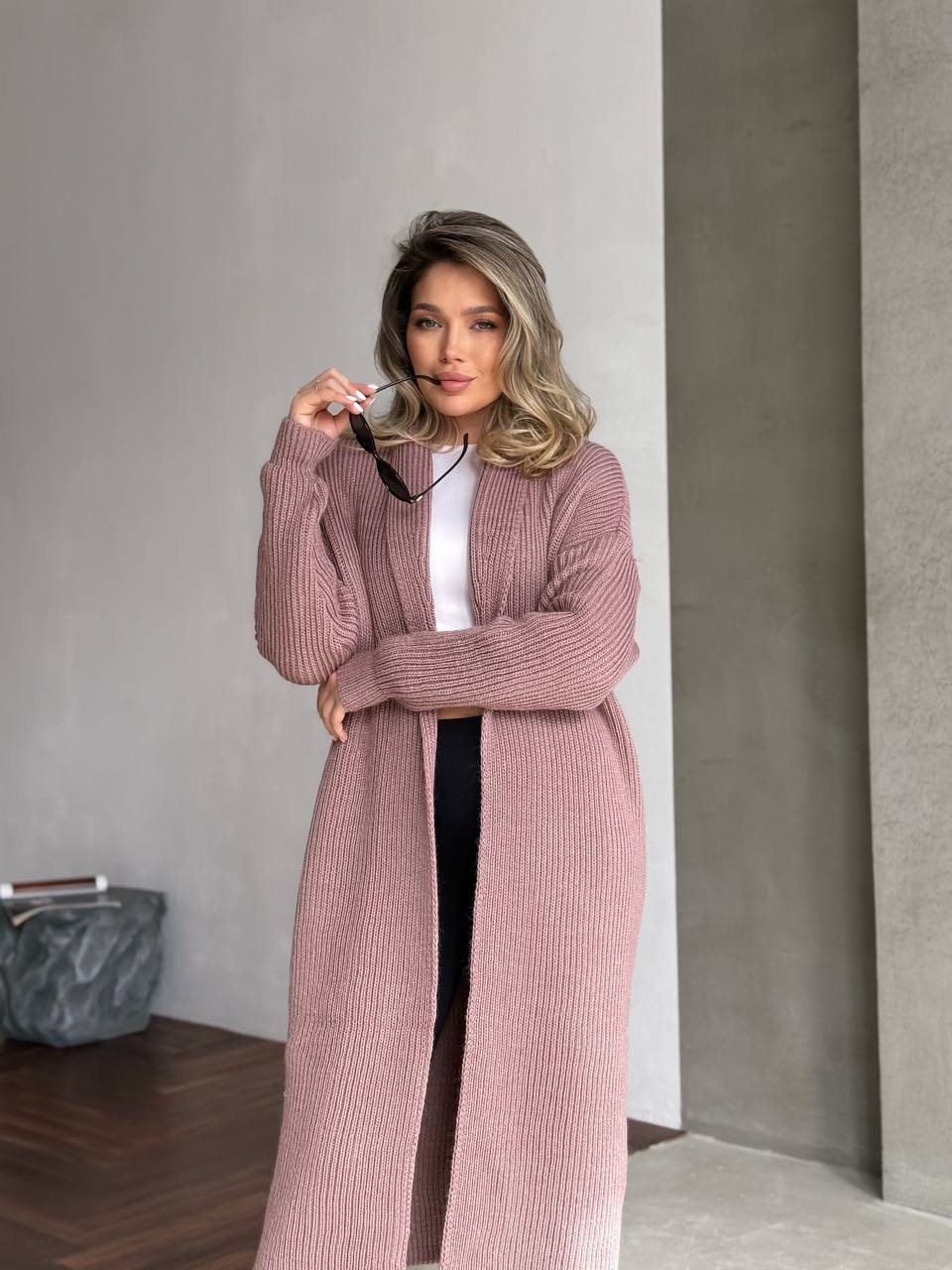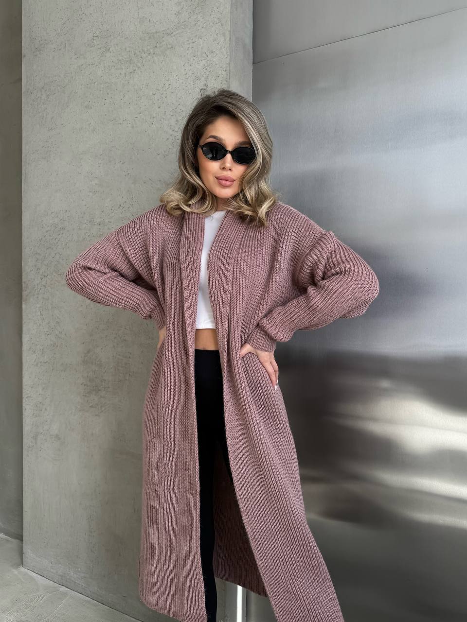 На фото кардиган виглядає сучасно та гармонійно: красиво витягує силует, м’яка текстура тканини додає затишку, а лаконічний дизайн дозволяє легко поєднувати модель як з класичними, так і з повсякденними образами. Кардиган ідеально підходить для створення багатошарових луків у прохолодну погоду.