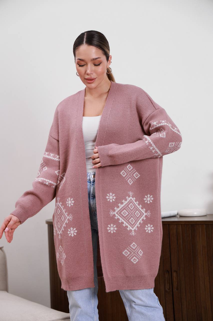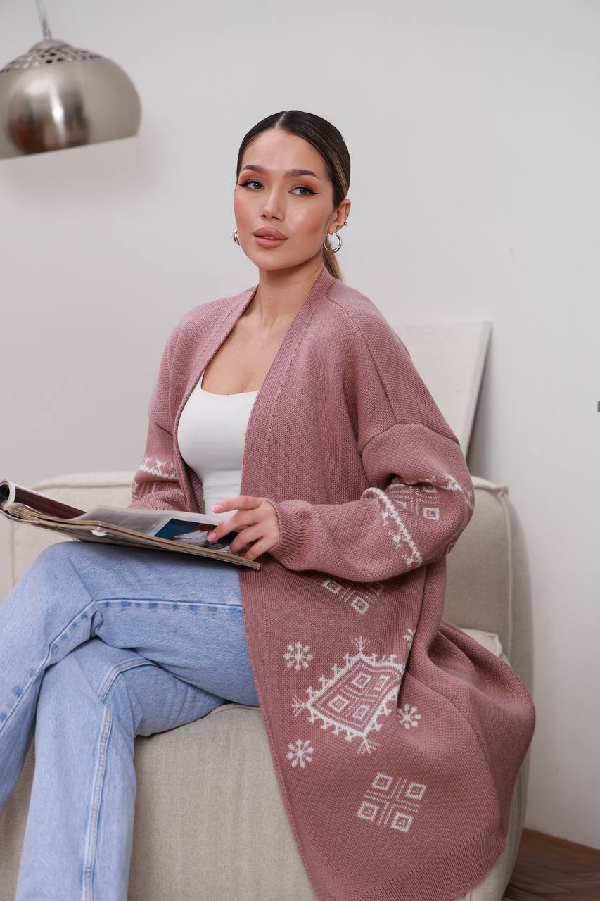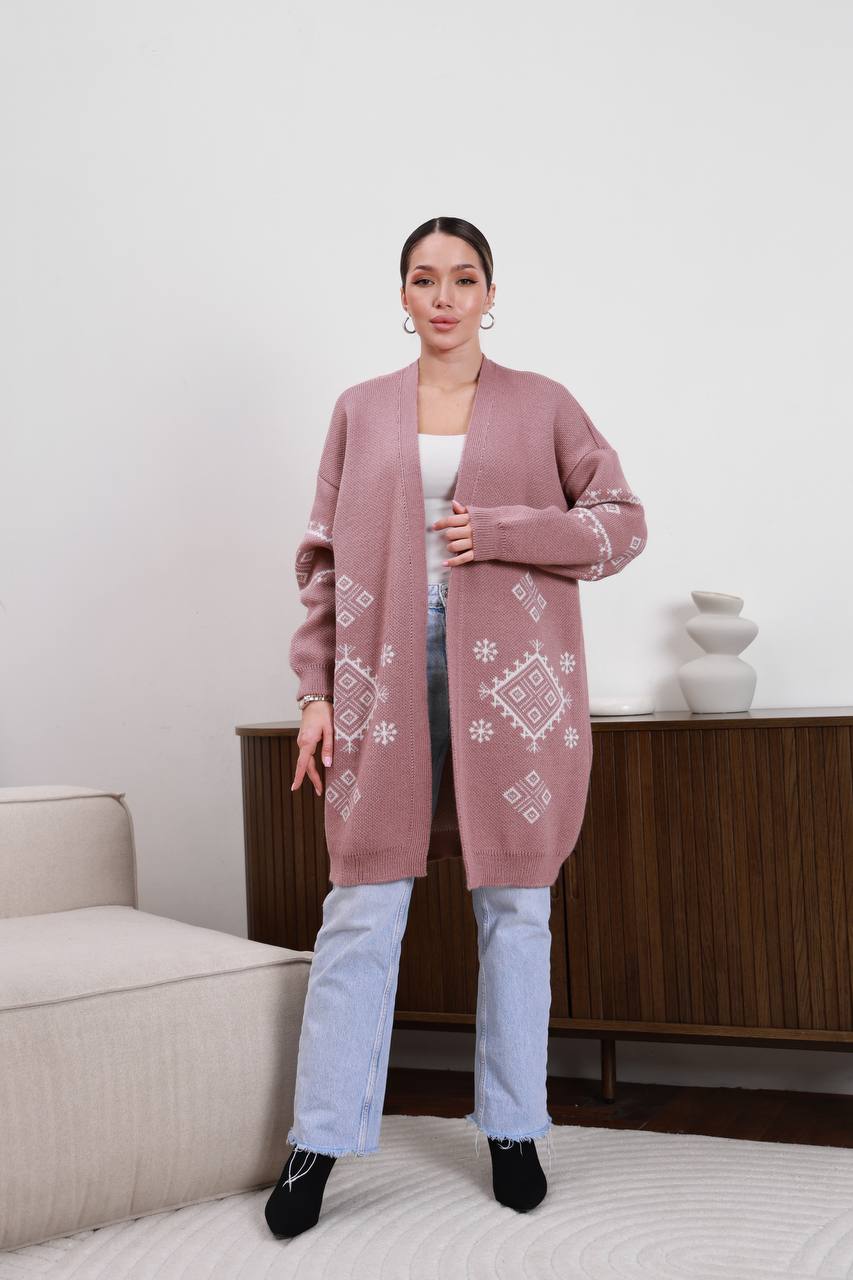 Жіночий в’язаний кардиган з етнічним візерунком кольору темна пудра — поєднує затишок, тепло та виразний дизайн. Модель прикрашена етнічним візерунком, що додає образу характеру та робить кардиган стильним акцентом у гардеробі.