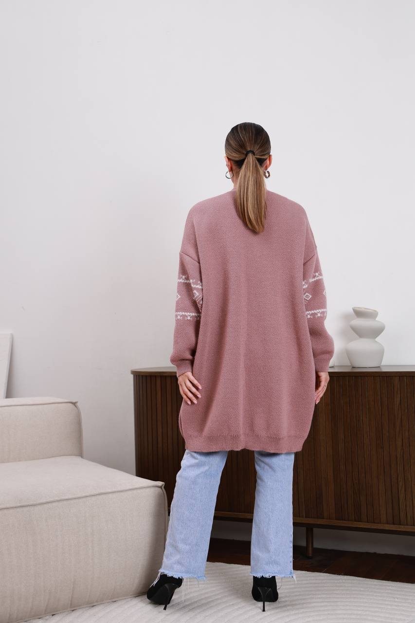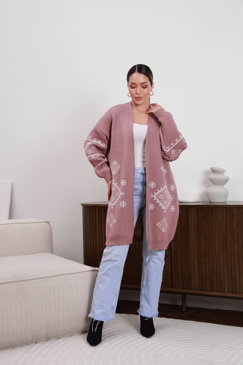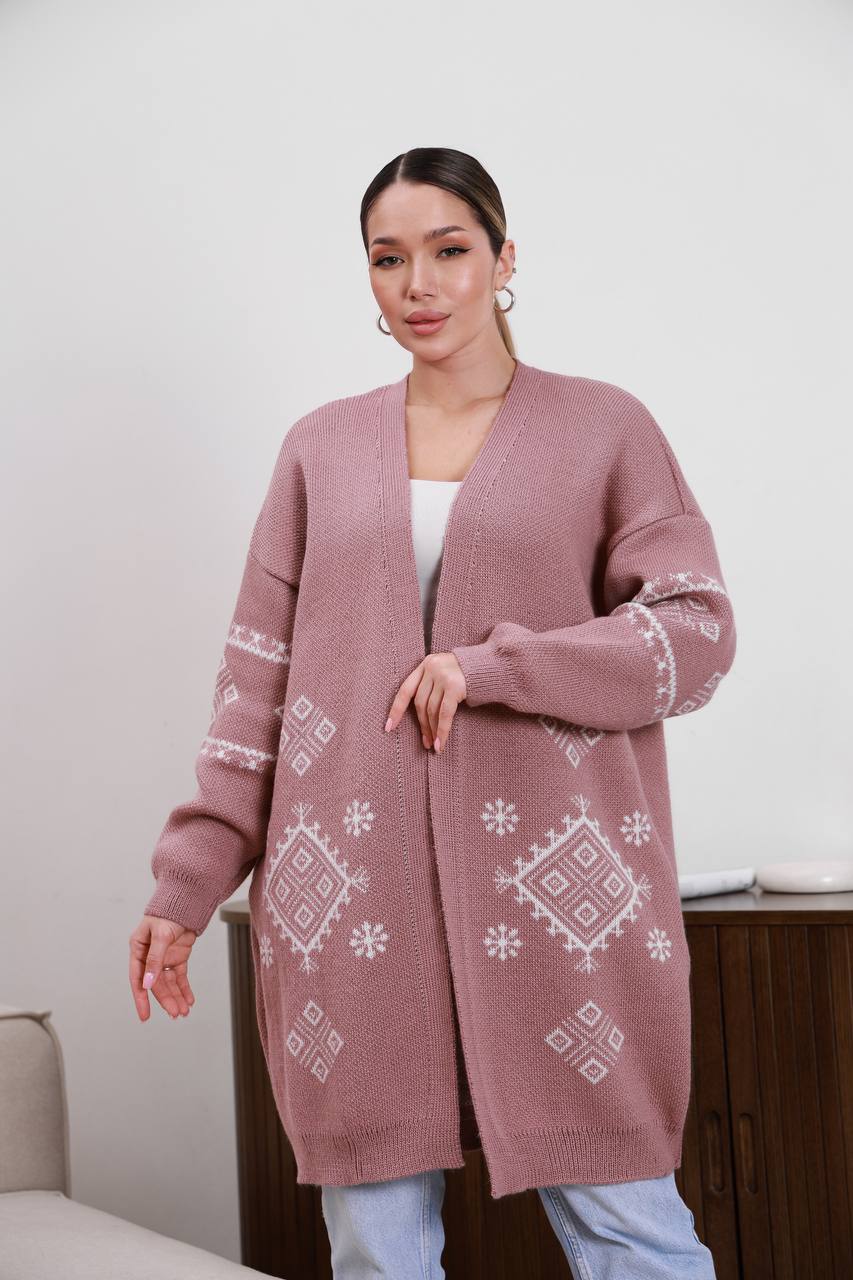 Жіночий в’язаний кардиган з етнічним візерунком кольору темна пудра — поєднує затишок, тепло та виразний дизайн. Модель прикрашена етнічним візерунком, що додає образу характеру та робить кардиган стильним акцентом у гардеробі.