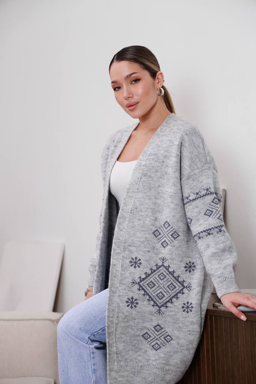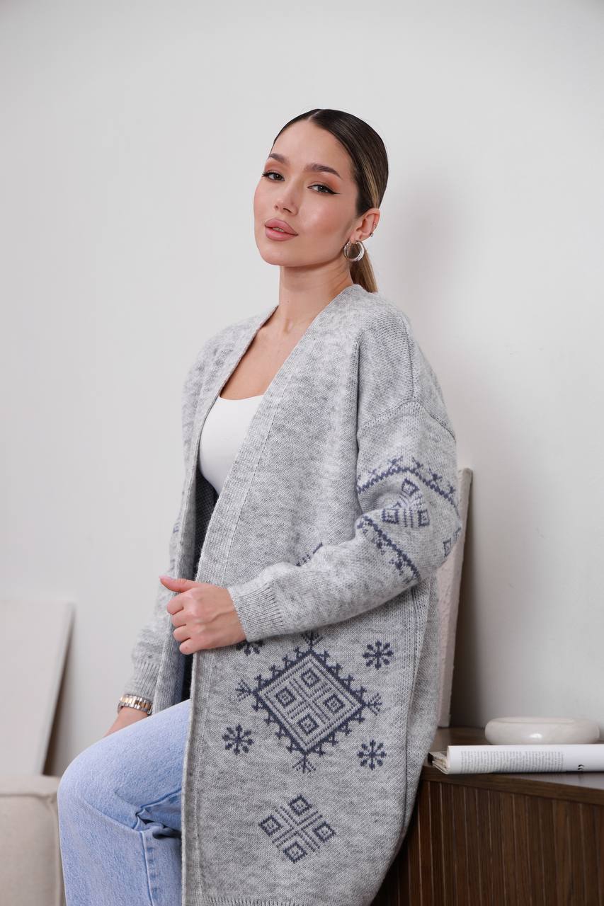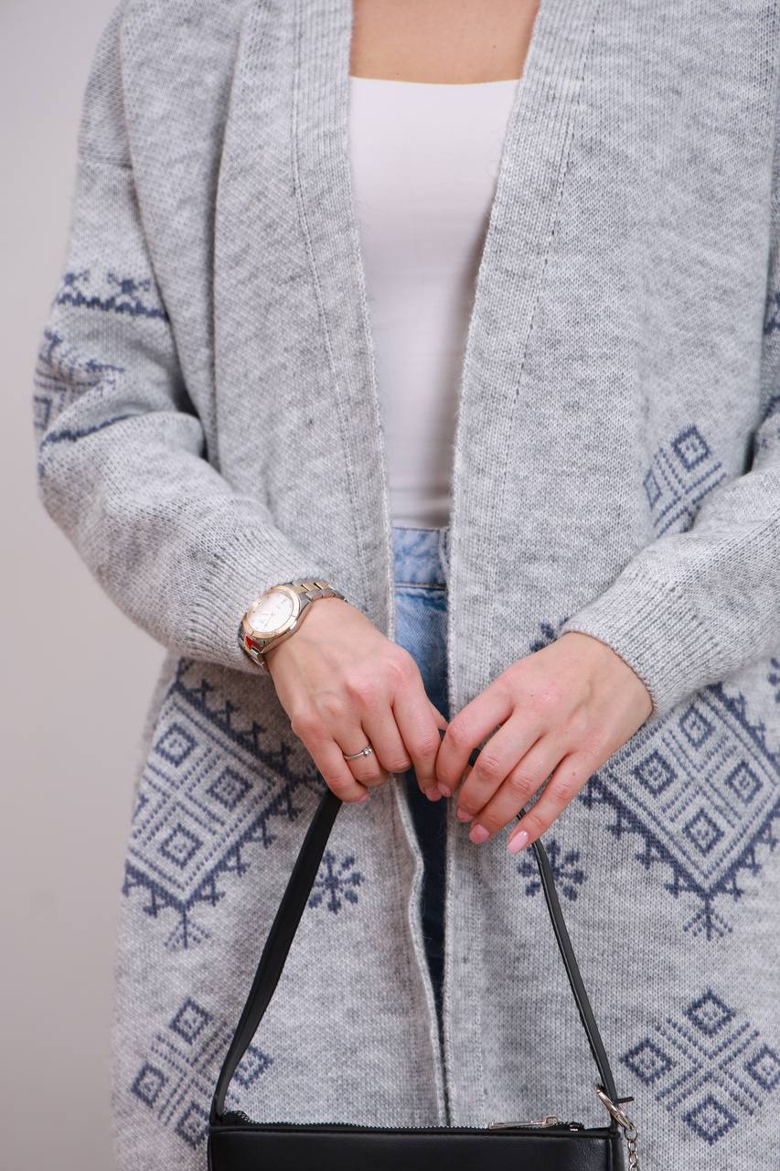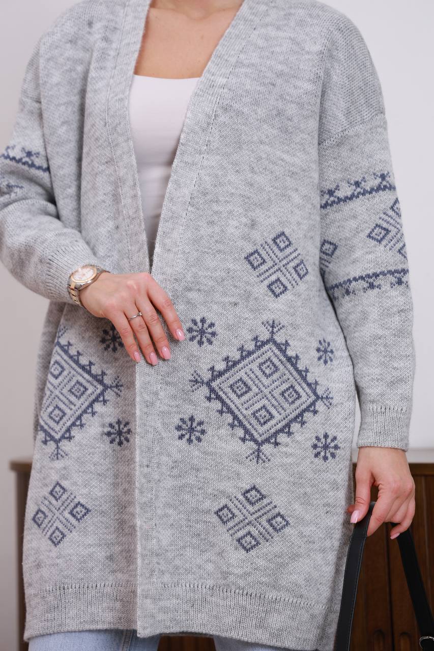 Жіночий в’язаний кардиган з етнічним візерунком сірого кольору 00598