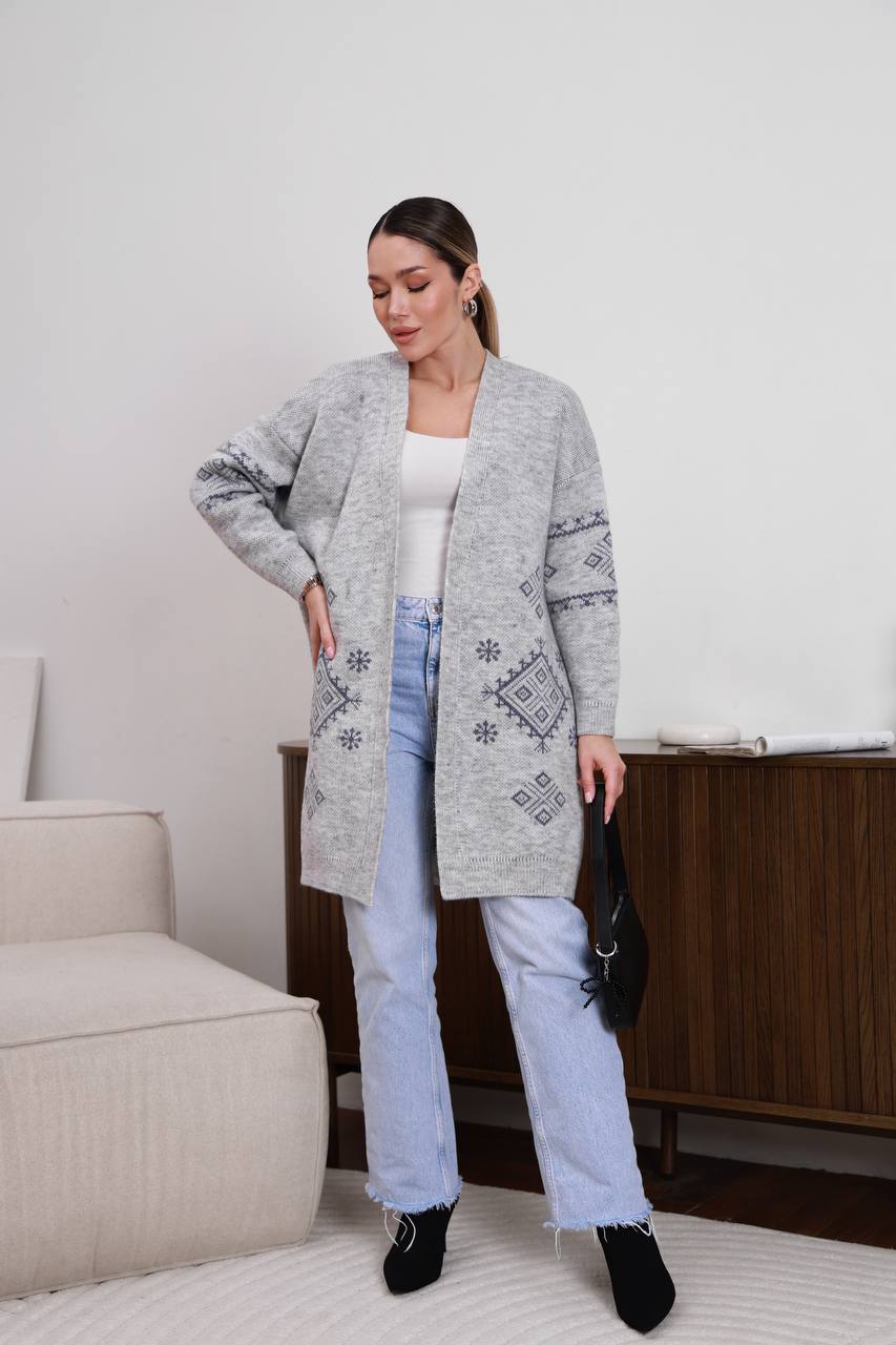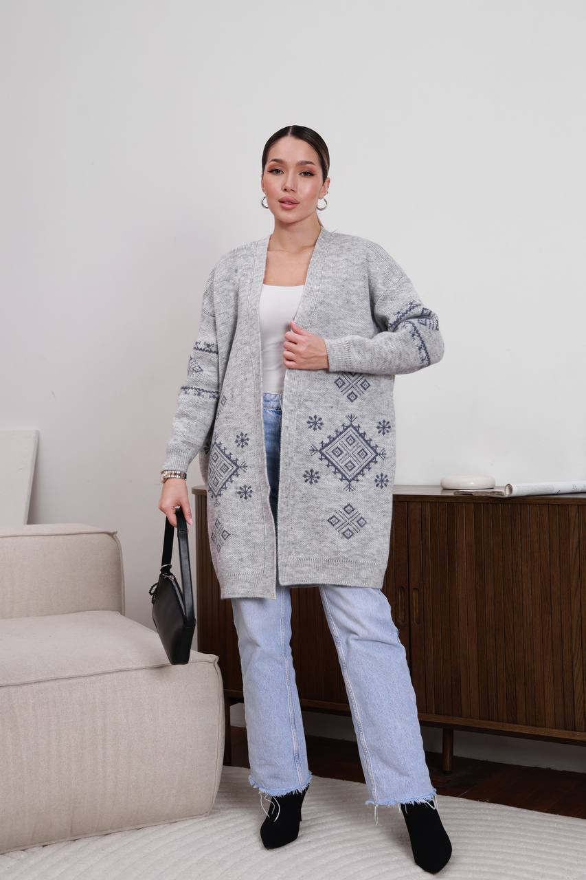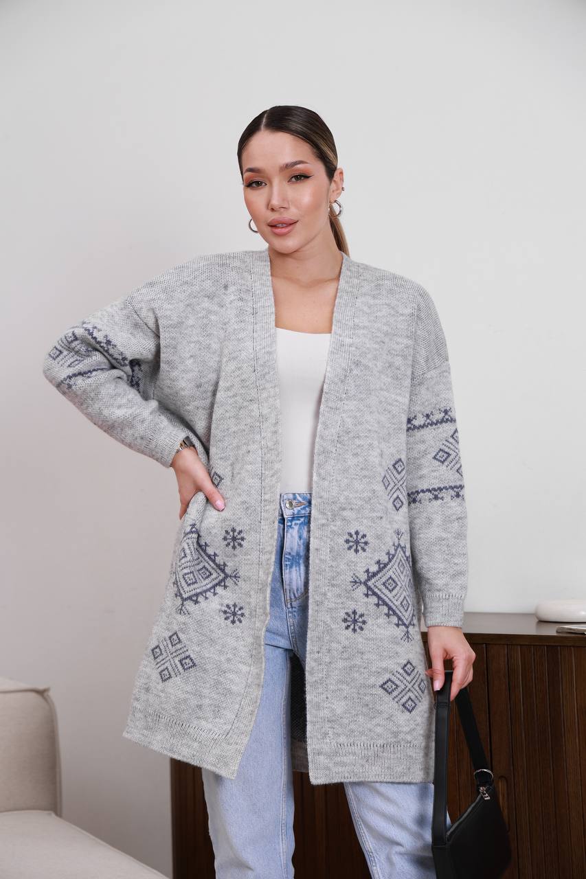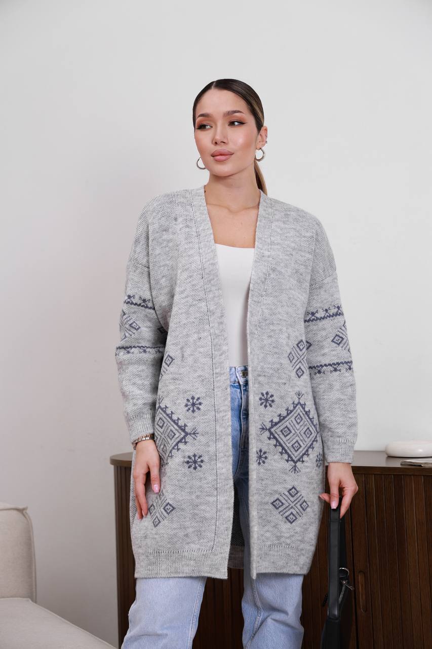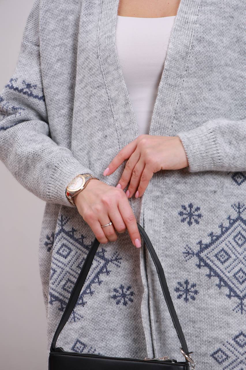 Жіночий в’язаний кардиган з етнічним візерунком сірого кольору 00598