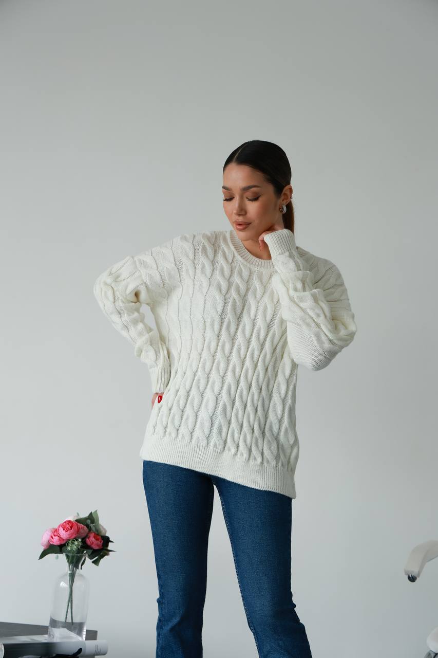 Додати до відстеження цінЖіночий в’язаний однотонний светр молочного кольору — стильна та комфортна модель для повсякденного гардероба. М’яка напіввовняна нитка МАРС приємна до тіла, добре утримує тепло та забезпечує комфорт у прохолодну погоду. Светр має універсальний фасон, який гарно сідає на різні типи фігури та не сковує рухів.